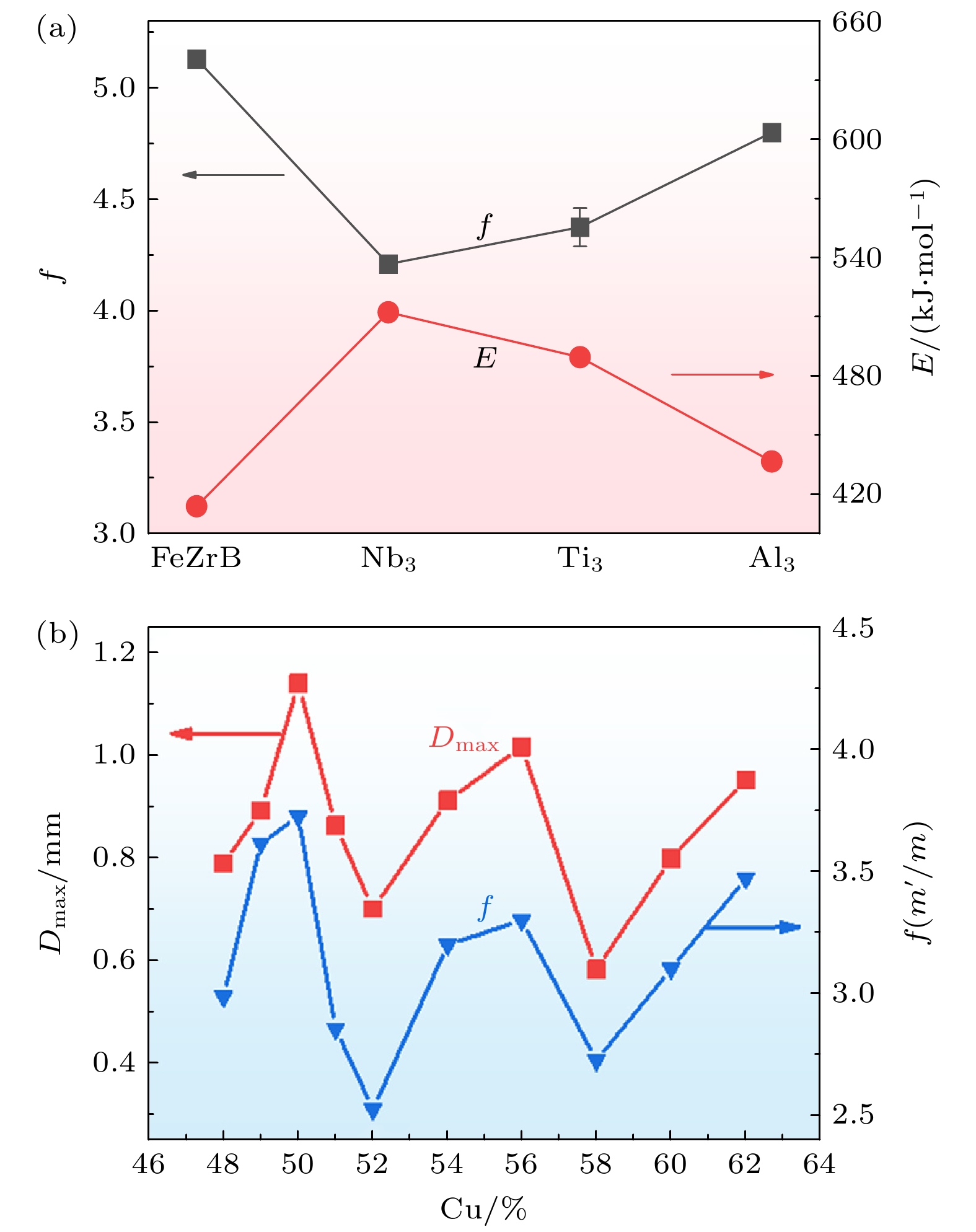 图 6 (a) Fe-Zr-B-M强脆转变系数f与晶化激活能E的关系; (b) CuZr合金玻璃形成的临界厚度Dmax、强脆转变系数f随Cu含量的变化[19]