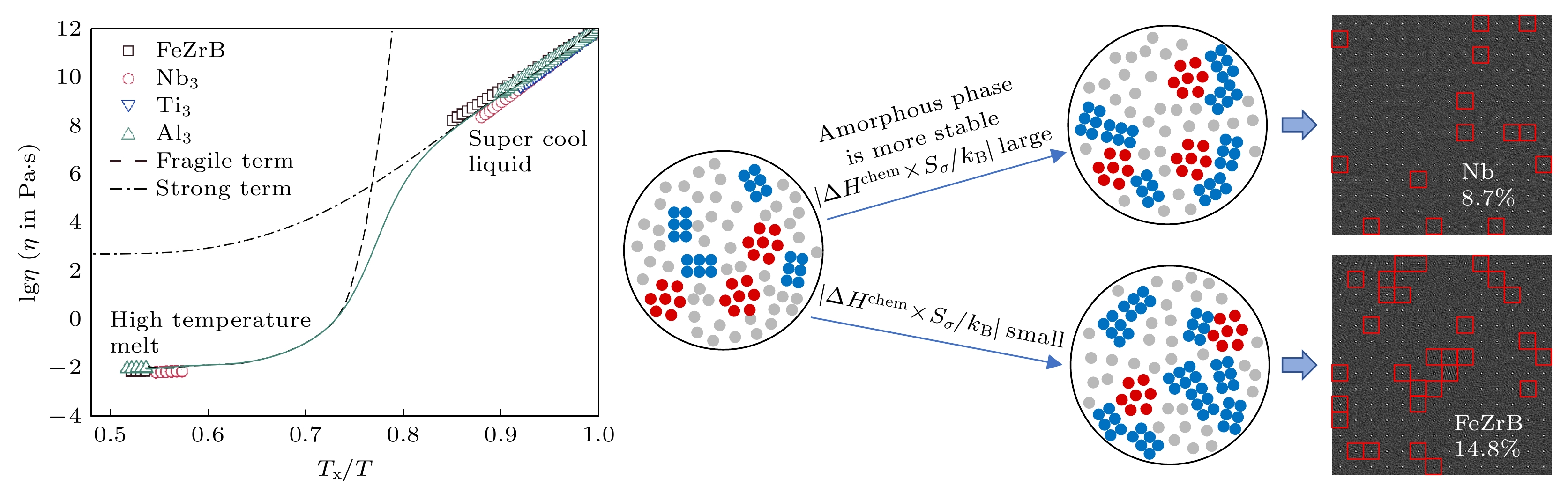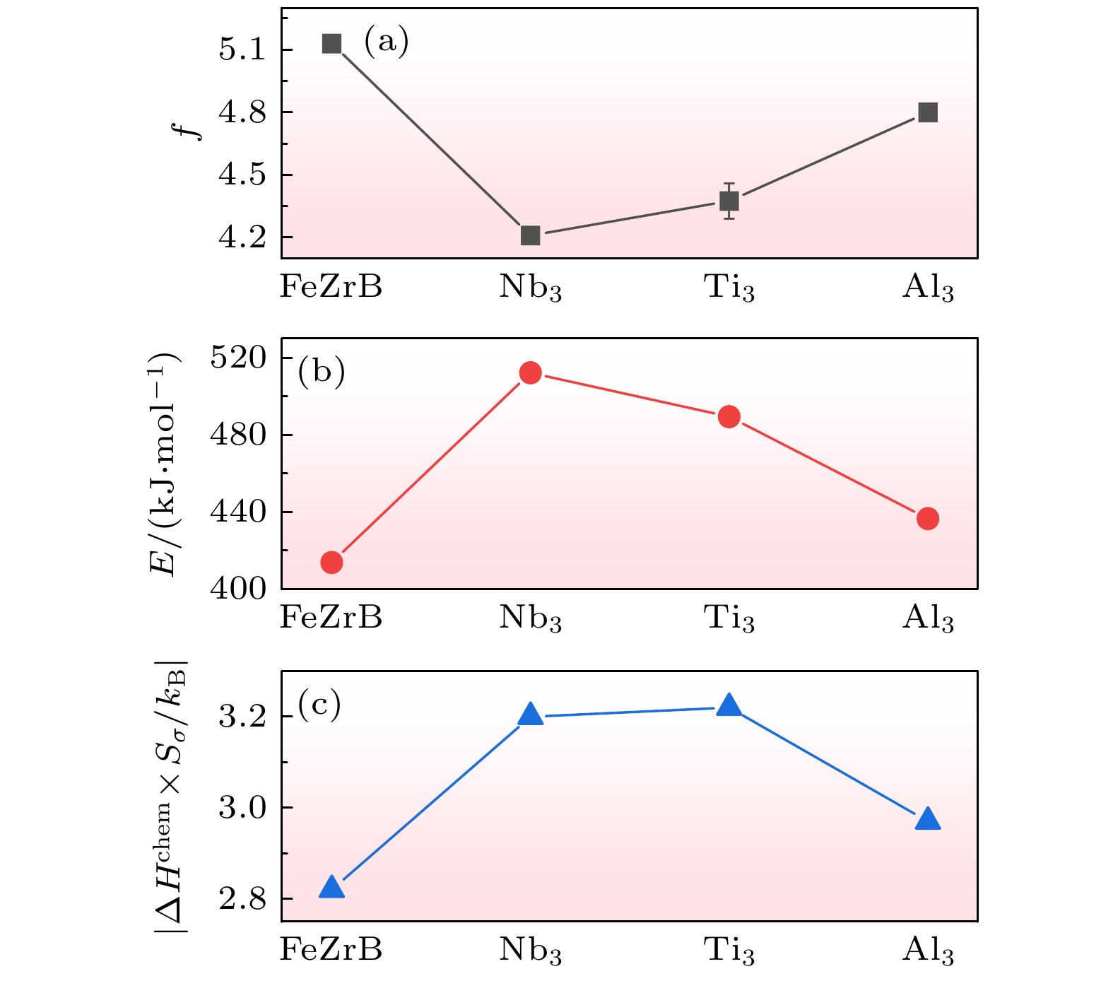 Table 3. The fragile-to-strong trasition parameter (f), the activation energy of crystallization (E), mixing enthalpy (∆Hchem), mismatch entropy (${{S}}_{\sigma}/{{k}}_{\text{B}} $) and their absolute multiplication of (Fe0.84Zr0.09B0.07)100–xMx (x = 0, 3; M = Nb, Ti, Al).