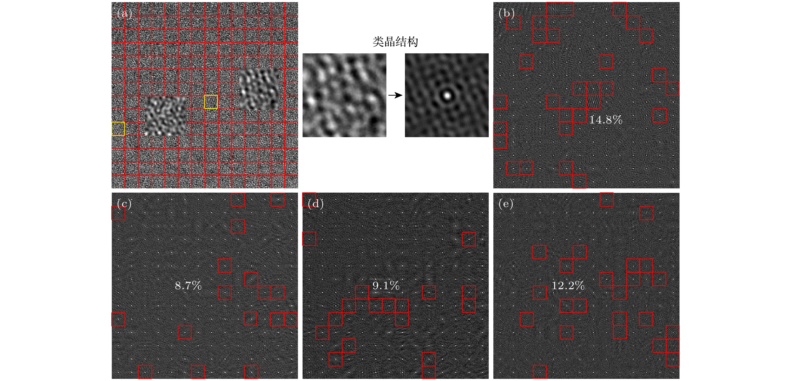 图 8 (a) 正方形的划分方法; (b)—(e) Fe84Zr9B7, (Fe0.84Zr0.09B0.07)97Nb3, (Fe0.84Zr0.09B0.07)97Ti3及(Fe0.84Zr0.09B0.07)97Al3自相关分析图像