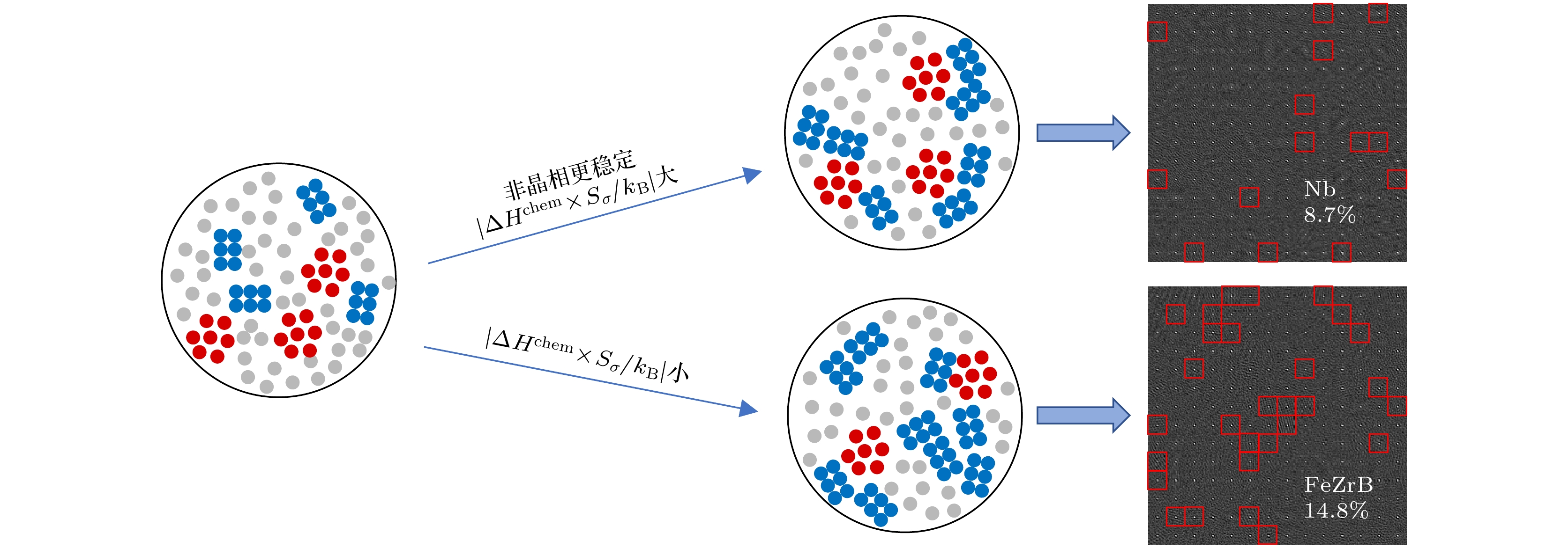 图 9 Fe-Zr-B-M体系在冷却过程中的团簇演变示意图, 蓝色圆点和红色圆点分别代表类晶团簇和二十面体团簇, 灰色圆点代表自由原子或者其他局域结构