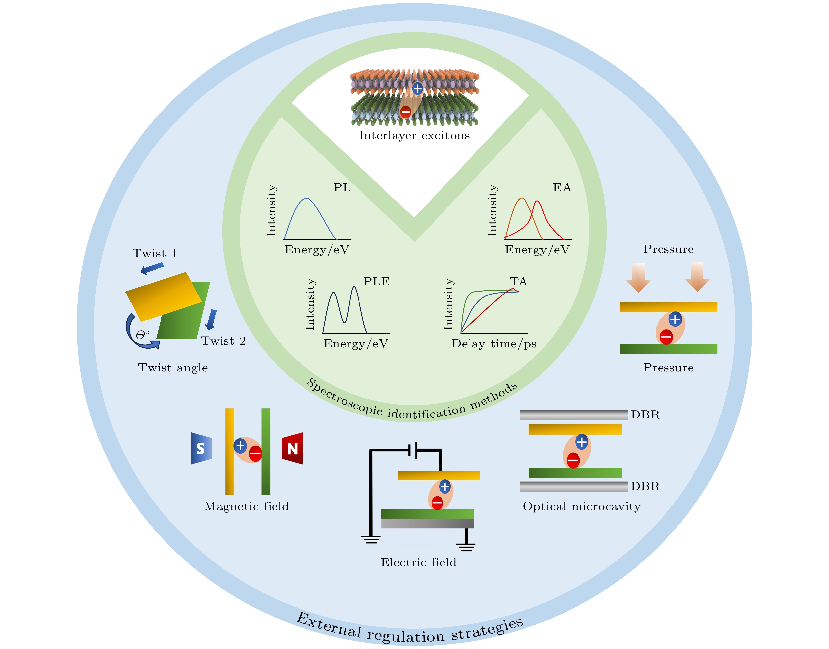 Figure 1. Schematic of interlayer exciton identification and regulation. The center illustrates the spatial configuration of interlayer excitons and representative spectroscopic techniques (PL, PLE, EA, TA), surrounded by common external tuning approaches such as electric field, magnetic field, pressure, optical microcavity, and twist angle.