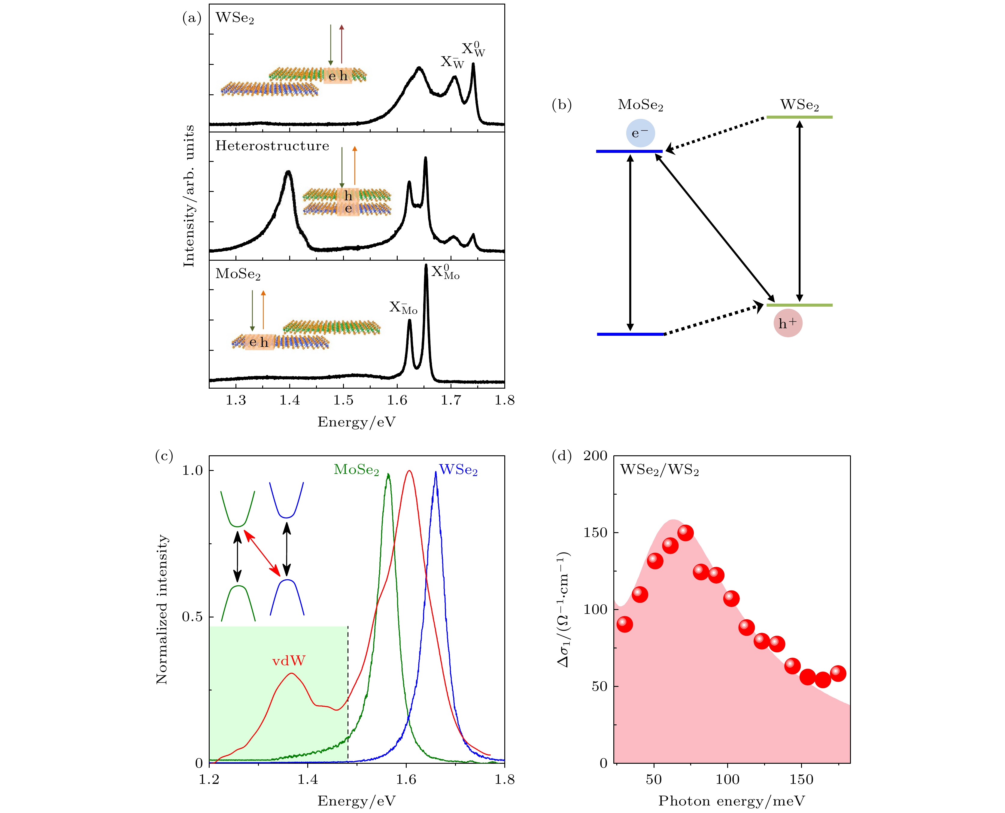图 2 层间激子的形成 (a) 单层WSe2、单层MoSe2和异质结构的光致发光光谱, 出自文献[19], 已获得授权; (b) 2D MoSe2/WSe2异质结的Ⅱ型半导体能带排列图, 出自文献[19], 已获得授权; (c) WSe2/MoSe2异质结及其单层组分的光致发光谱对比, 1.36 eV处的发光峰来源于层间激子复合, 出自文献[13], 已获得授权; (d) WSe2/WS2异质结构中层间激子的1s-2p跃迁(67 meV)中红外吸收谱, 出自文献[12], 已获得授权