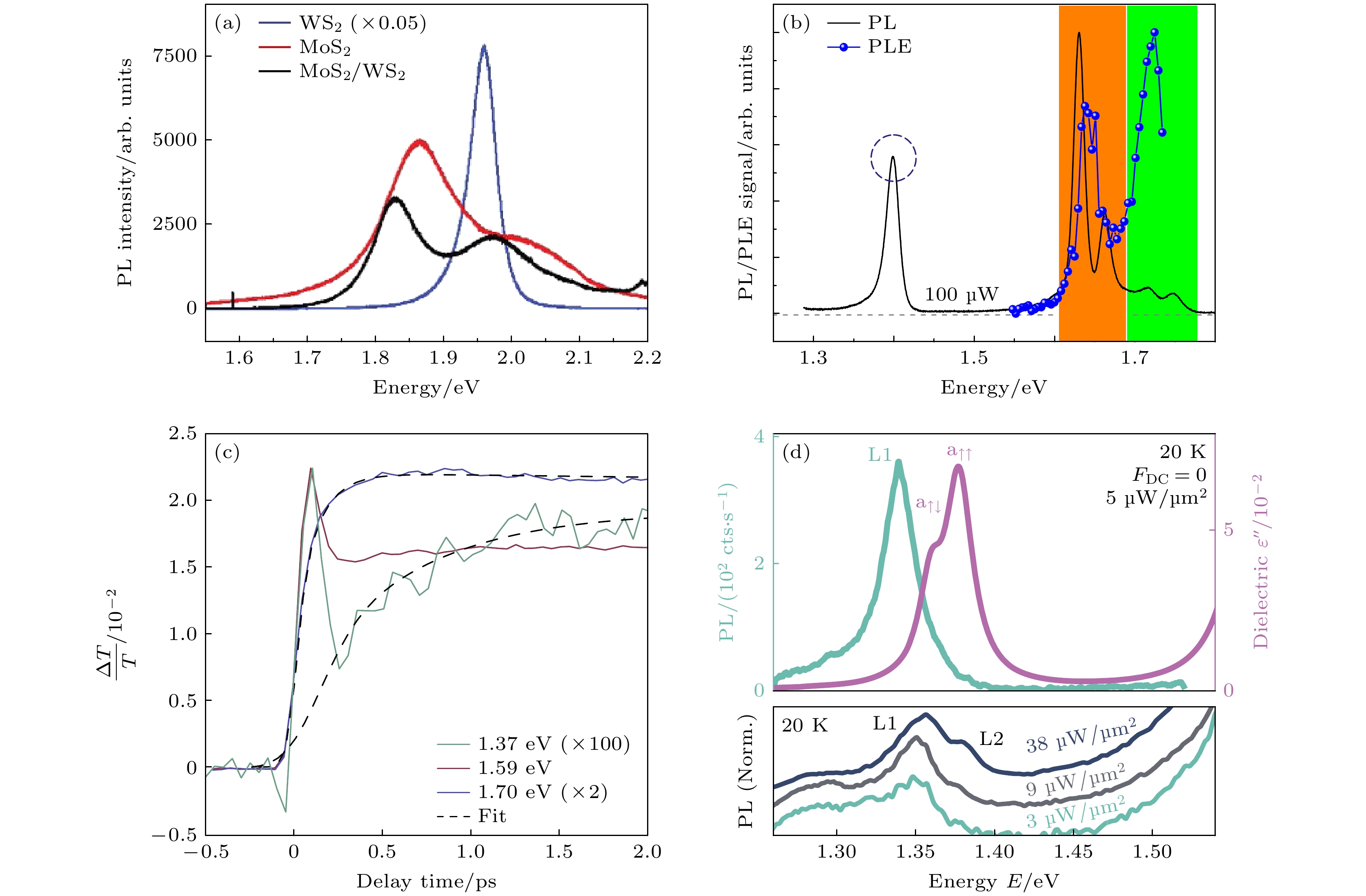图 3 层间激子的判断 (a) 单层WS2, MoS2以及WS2/MoS2异质结构的PL谱, 出自文献[10], 已获得授权; (b) MoSe2/WSe2异质结构的PLE谱, 出自文献[50], 已获得授权; (c) 超快瞬态吸收(TA)谱中IXs形成的延迟(0.8 ps)与层间空穴转移(IHT)过程(0.2 ps), 出自文献[51], 已获得授权; (d) 电调制吸收(EA)谱中IX的本征吸收峰(1.359 eV, 1.377 eV)与PL间接跃迁峰(L1), 出自文献[37], 已获得授权