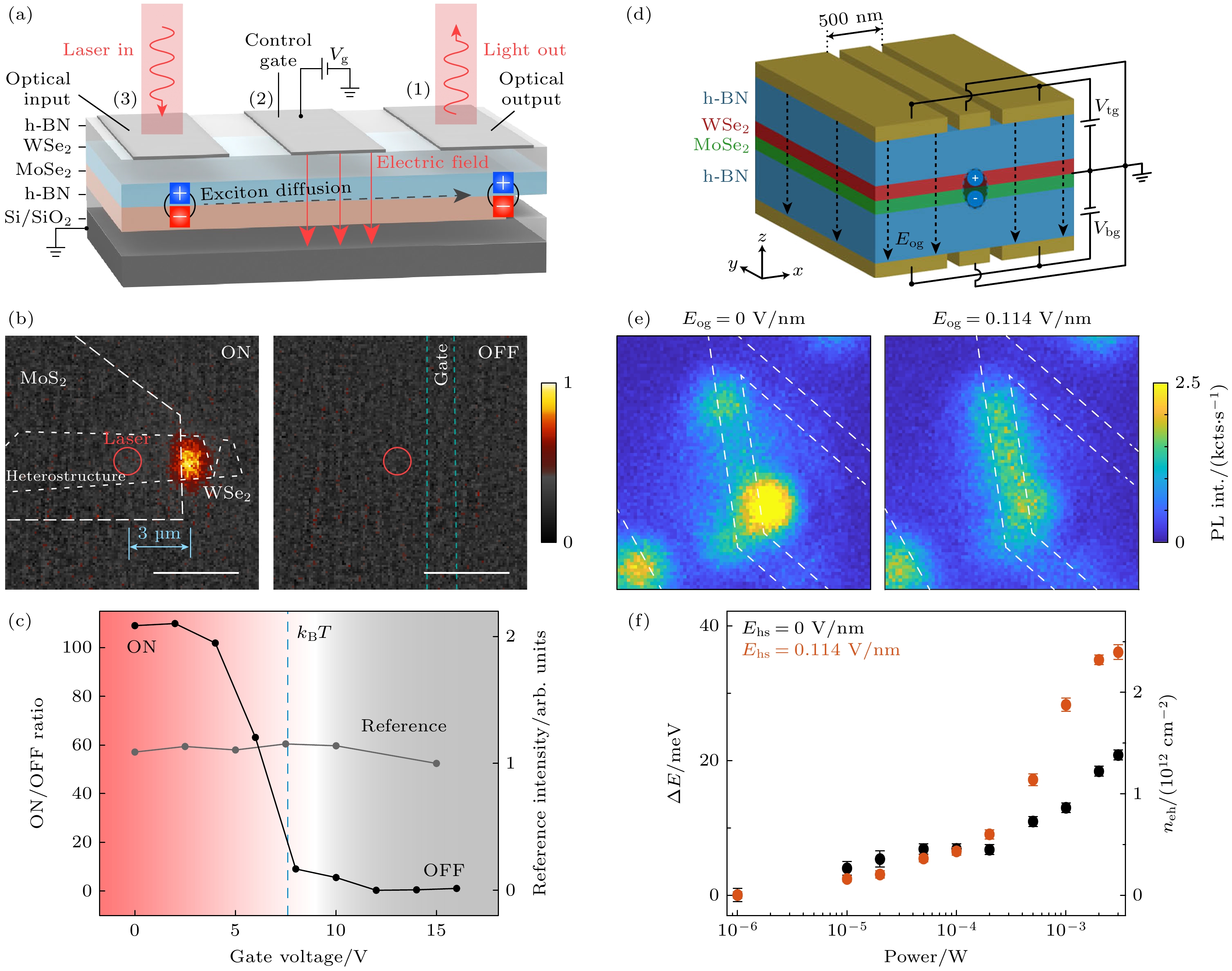 图 4 电场调节层间激子密度 (a) WSe2/MoSe2激子晶体管结构示意图, 出自文献[31], 已获得授权; (b) 栅压调控激子流开关(ON/OFF状态)的PL强度对比, 出自文献[31], 已获得授权; (c) WSe2/MoSe2激子晶体管开关比随栅压的变化, 出自文献[31], 已获得授权; (d) 双栅极结构的WSe2/MoSe2异质结激子晶体管示意图, 出自文献[60], 已获得授权; (e) 无陷阱势与陷阱势下的层间激子光致发光空间分布图, 出自文献[60], 已获得授权; (f) 不同外栅电场下, 层间激子蓝移能量ΔE及对应的电子-空穴对密度随激发功率的变化关系, 出自文献[60], 已获得授权