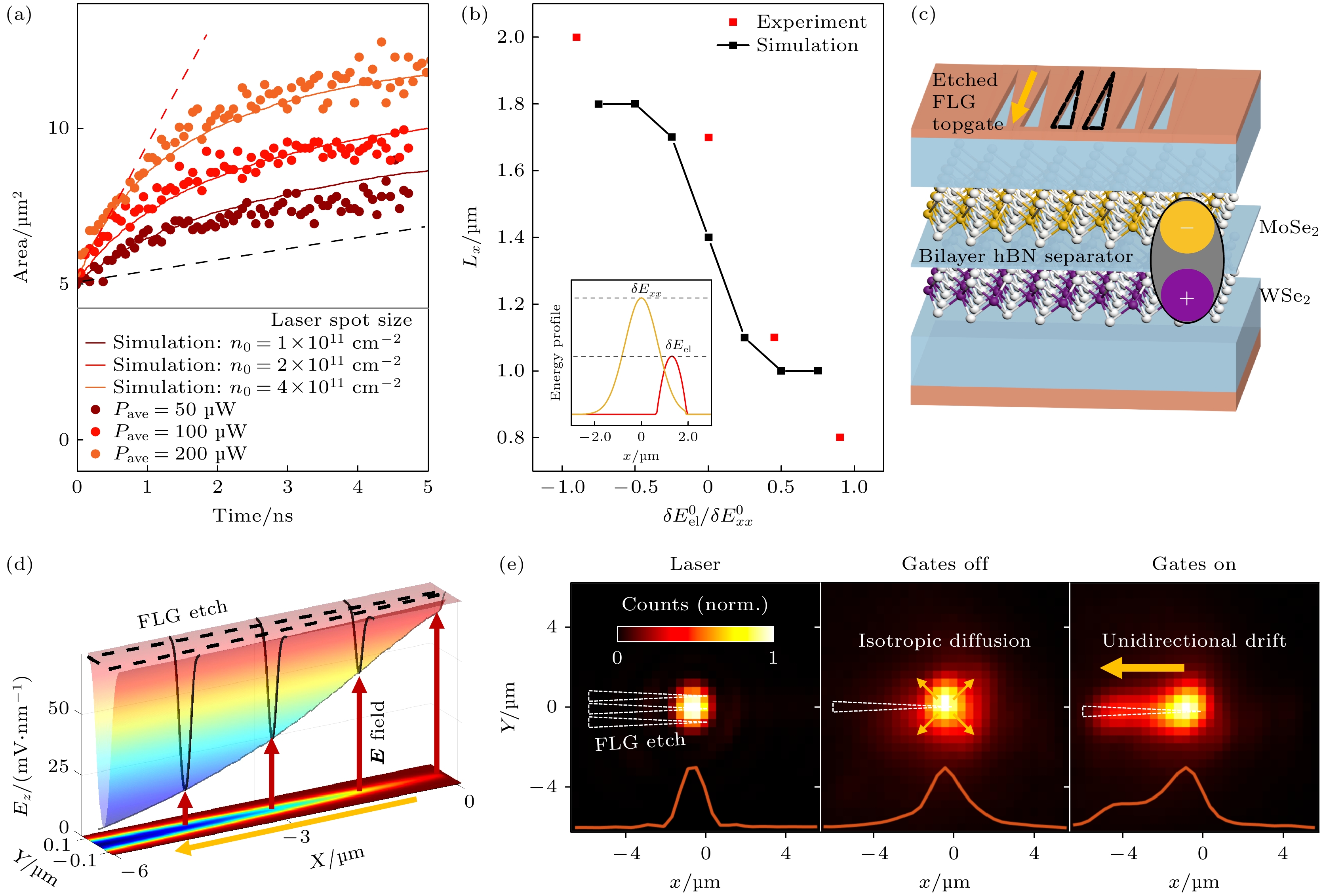 图 5 电场调控激子输运 (a) WSe2/hBN/MoS2三明治结构中激子扩散受电场势能(δEel)与激子-激子排斥(δExx)协同调控的示意图, 出自文献[61], 已获得授权; (b) 激子传播距离Lx随静电势能与激子-激子排斥能比值δEel/δExx的变化关系, 插图为模拟中的势能分布示意图, 出自文献[61], 已获得授权; (c) 纳米图案化MoSe2/WSe2异质结的器件示意图, 出自文献[62], 已获得授权; (d) MoSe2/WSe2异质结的三角形电势“滑道”设计示意图, 出自文献[62], 已获得授权; (e) 激发激光强度分布的CCD图像, 出自文献[62], 已获得授权