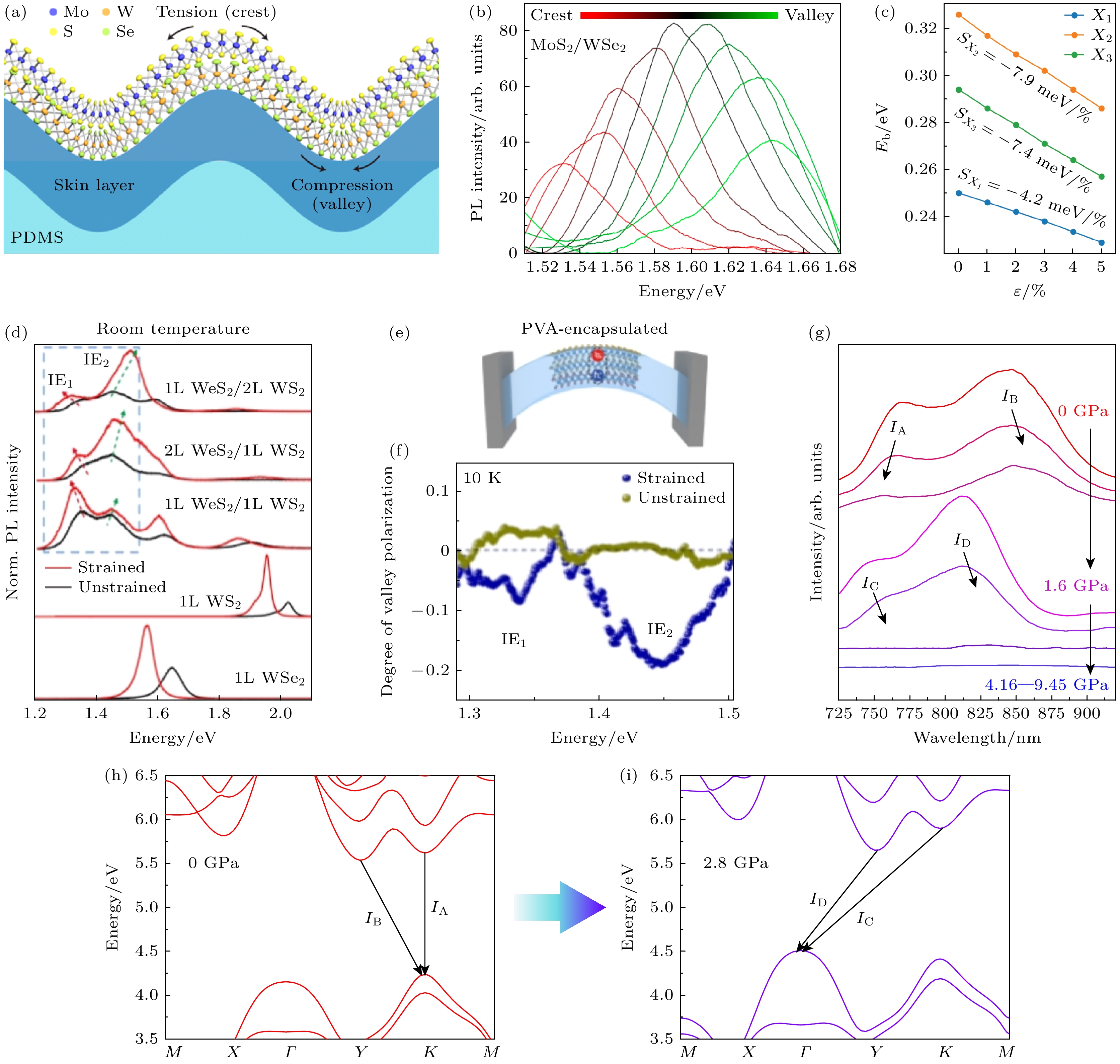 Figure 6. Strain-engineered interlayer excitons: (a) Schematic of periodic wrinkle structures in MoS2/WSe2 heterobilayers, where peak and valley regions introduce tensile and compressive strains, respectively, reproduced with permission from Ref. [69]; (b) continuous tuning of exciton emission peak energy along the wrinkle profile, showing a total modulation range of 107 meV, reproduced with permission from Ref. [69]; (c) GW+BSE calculated binding energies of interlayer and intralayer excitons under biaxial strain in MoSe2/WSe2 heterostructures, reproduced with permission from Ref. [70]; (d), (e) PL enhancement and valley polarization effects (20% polarization degree at 10 K) in WSe2/WS2 heterostructures under tensile strain, reproduced with permission from Ref. [71]; (f) schematic of strain-induced valley potential inequality, reproduced with permission from Ref. [71]; (g) evolution of excitonic states and band rearrangement in WSe2/MoSe2 heterostructures under hydrostatic pressure, reproduced with permission from Ref. [65]; (h), (i) schematic of pressure-induced band rearrangement (low-pressure vs. high-pressure band alignment), reproduced with permission from Ref. [65].