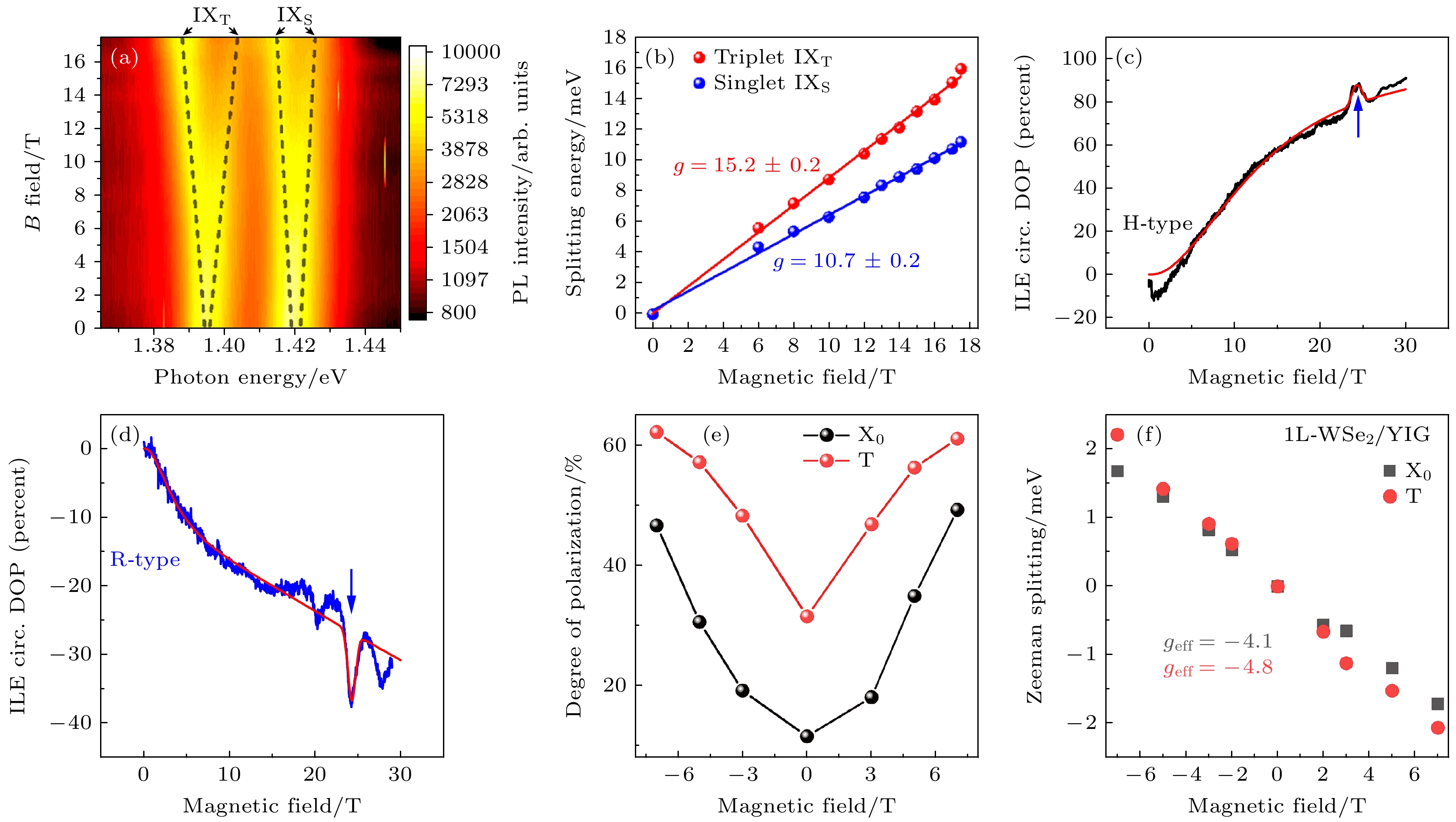 图 7 磁场调控层间激子 (a) WSe2/MoSe2异质结构中自旋单重态(IXS)与三重态(IXT)的PL谱随磁场的变化, 出自文献[27], 已获得授权; (b) IXS和IXT的谷Zeeman劈裂能隙及g因子(高达~15.2)的磁场依赖关系, 出自文献[27], 已获得授权; (c), (d) H型和R型堆叠异质结在24.2 T磁场下的谷极化度共振增强现象, 出自文献[80], 已获得授权; (e) WSe2/YIG异质结构中中性激子(X0)和带电激子(T)的谷极化度随磁场的变化, 出自文献[82], 已获得授权; (f) 谷塞曼劈裂随外磁场的线性变化特征, 出自文献[82], 已获得授权