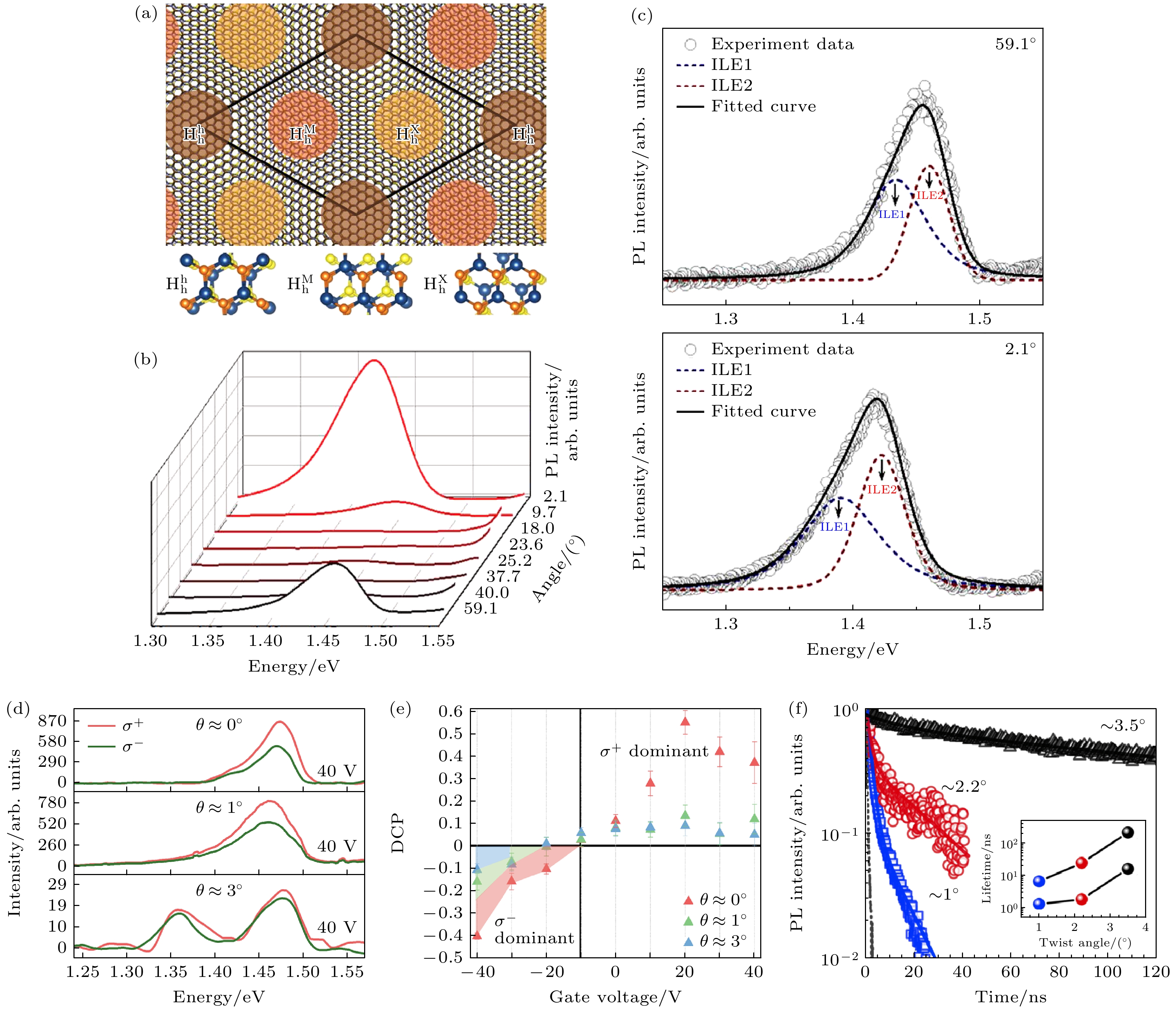 图 8 扭转角调控层间激子 (a) WS2/WSe2异质结构中ADF-STEM成像显示的~7.6 nm莫尔周期, 出自文献[5], 已获得授权; (b), (c) WSe2/WS2异质结构中激子PL强度及跃迁路径(K-K直接跃迁与Q-K间接跃迁)随扭转角的变化, 出自文献[87], 已获得授权; (d), (e) 不同扭转角下层间激子圆偏振发射方向反转及极化度周期性波动行为, 出自文献[88], 已获得授权; (f) MoSe2/WSe2异质结构中层间激子寿命随扭转角的变化趋势(1°—3.5°), 出自文献[90], 已获得授权