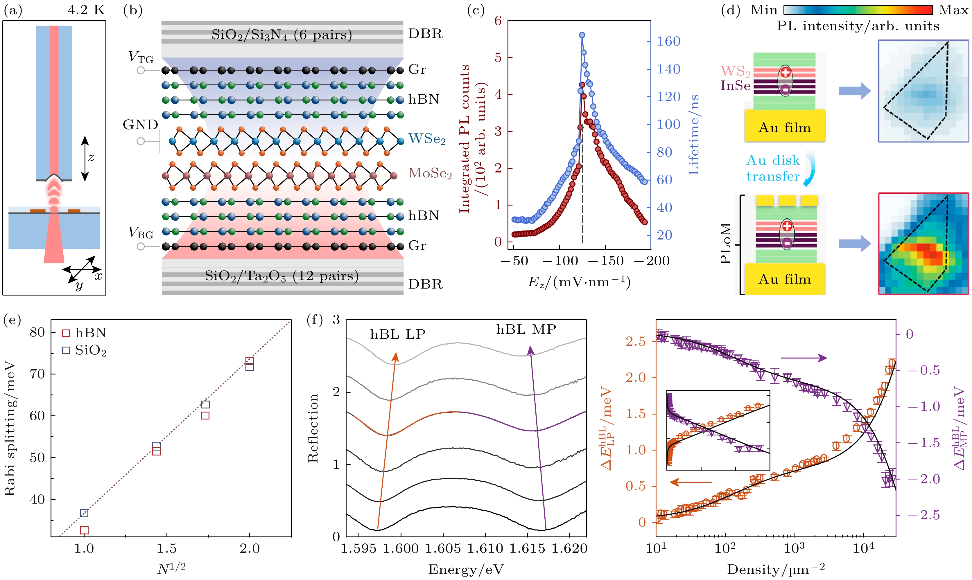 Figure 9. Optical field resonance control: (a) Cavity setup at 4.2 K, the fiber-based micro-mirror forms the cavity together with a planar macro-mirror with CVD-grown MoSe2-WSe2 heterostructure on top, reproduced with permission from Ref. [92]; (b) schematic of the device structure, comprising a MoSe2 /WSe2 heterobilayer encapsulated with hBN, with bottom and top graphene (Gr) layers, bottom (VBG) and top (VTG) gate voltages are applied to the graphene layers, respectively, while the TMD flakes are grounded (GND), the cavity consists of the bottom and top SiO2 layers and the van der Waals heterostack, reproduced with permission from Ref. [93]; (c) total integrated IX PL intensity (red) and lifetime (blue) as a function of Ez, reproduced with permission from Ref. [93]; (d) the right column shows the schematic diagrams of the heterojunction without PLoM structure (top) and with PLoM structure (bottom), while the left column presents the photoluminescence mapping images of interlayer excitons without PLoM structure (top) and with PLoM structure (bottom), reproduced with permission from Ref. [94]; (e) Rabi splitting as a function of the square root of the number of layers for different insulators, hBN (red) and SiO2 (blue), a clear N1/2 enhancement of the coupling strength is found, reproduced with permission from Ref. [96]; (f) the upper figure shows the reflection spectra of moiré lower polaritons (LPs) and middle polaritons (MPs) at zero detuning under different pumping densities, the lower figure shows the relationship between the energy shift of moiré heterobilayer polaritons and carrier density, reproduced with permission from Ref. [98].