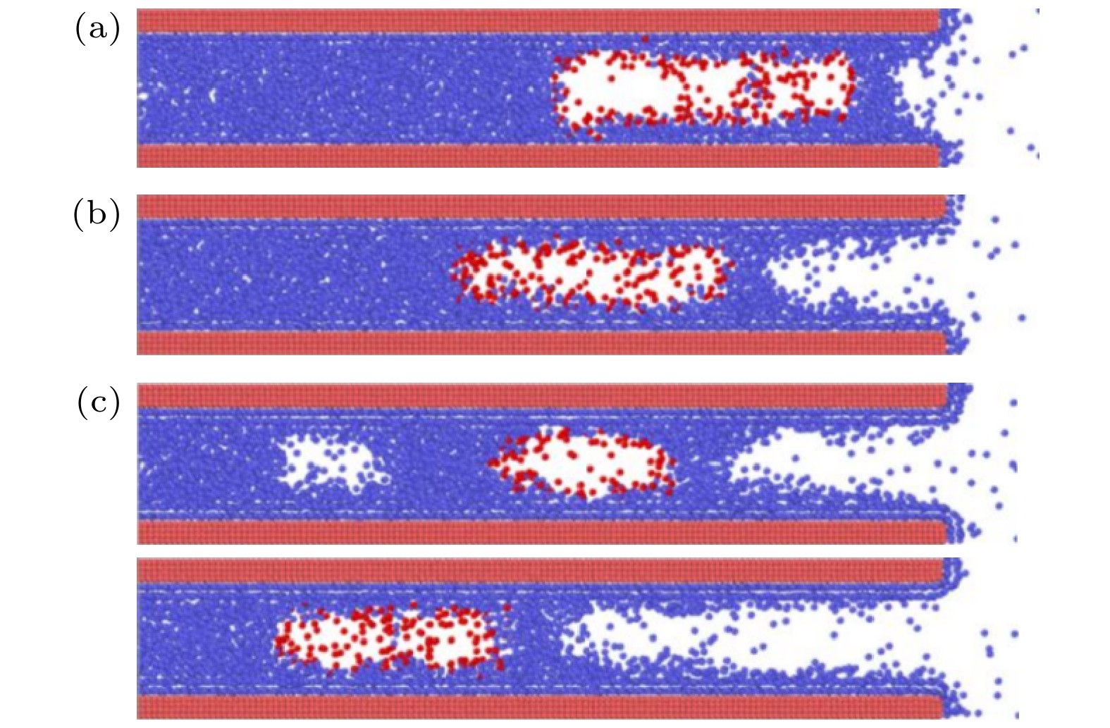 Figure 12. Vapor atoms within cavitation bubbles immediately before collapse under different solid-liquid interaction strengths: (a) $ {\varepsilon }_{\mathrm{s}\mathrm{l}}={\varepsilon }_{\mathrm{l}\mathrm{l}} $; (b) $ {\varepsilon }_{\mathrm{s}\mathrm{l}}={2\varepsilon }_{\mathrm{l}\mathrm{l}} $; (c) $ {\varepsilon }_{\mathrm{s}\mathrm{l}}={4\varepsilon }_{\mathrm{l}\mathrm{l}} $.