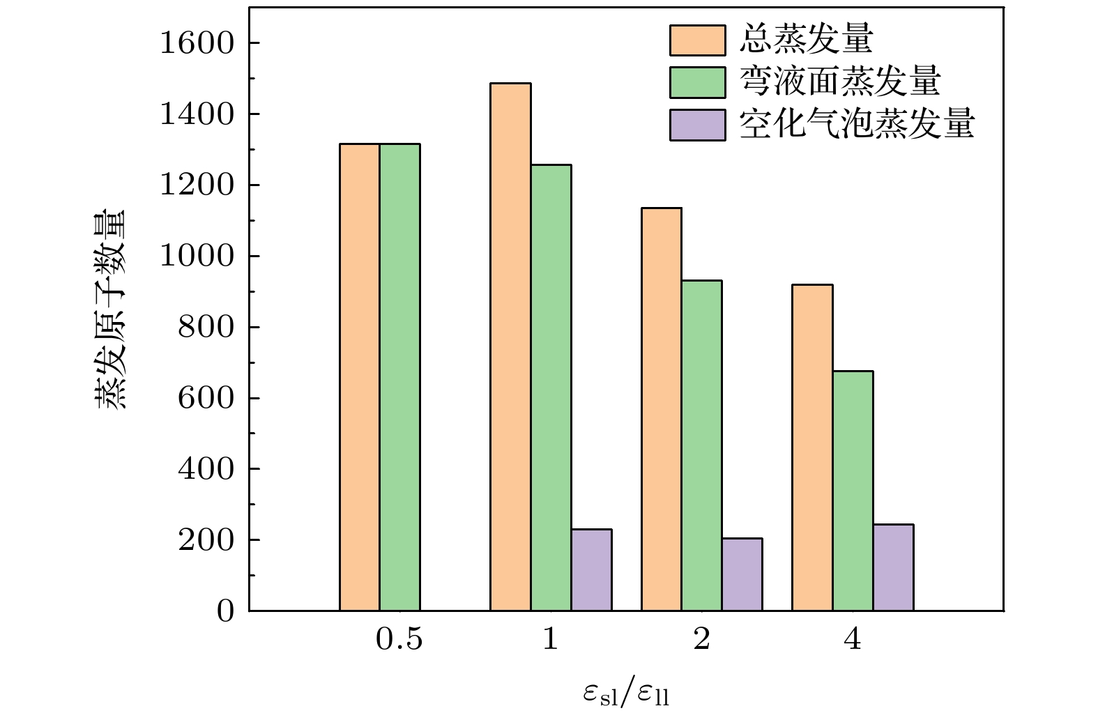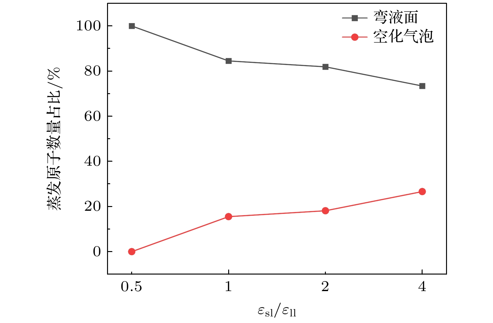 Liquid evaporation on a nanoscale is significantly strengthened by microscopic effects, with its rate even exceeding the predicted upper limit of the classical Hertz-Knudsen equation. This property makes nanoscale liquid evaporation highly valuable for applications in solar-driven interfacial evaporation, electronics cooling, and microfluidics. However, existing research predominantly focuses on the influence of individual microscopic effects, leaving the synergistic mechanisms of multiple effects to be poorly understood. To deeply reveal the microscopic mechanism of liquid phase change on a nanoscale, this study employs liquid argon as a model system to systematically investigate the synergistic effect of potential energy and cavitation on its evaporation. Using molecular dynamics simulations, we study the evaporation process of liquid argon within nanochannels characterized by different solid-liquid interaction strengths under identical temperature and time frame. The results indicate that an increase in the solid-liquid interaction strength reduces the average potential energy of liquid argon and increases the evaporation energy barrier, which theoretically should suppress the evaporation. Nevertheless, the capillary pressure induced by the increased meniscus curvature leads to negative pressure within the liquid argon, triggering a cavitation effect. This cavitation generates bubbles inside the liquid argon, which significantly increases the evaporation surface area and consequently promotes evaporation. Furthermore, the meniscus-dominated evaporation mode is gradually weakened, while the contribution from cavitation bubbles becomes increasingly pronounced. This study demonstrates that the evaporation rates of liquid argon in the four nanochannels with different interaction strengths are 3.49 × 10–14, 3.95 × 10–14, 3.02 × 10–14, and 2.44 × 10–14 kg/s, respectively. Therefore, it can be concluded that the evaporation rate does not vary linearly with the increase of solid-liquid interaction strength. On the contrary, under moderate interaction intensity, the optimal synergistic state between potential energy and the cavitation effect is achieved, thereby obtaining a maximum evaporation rate.