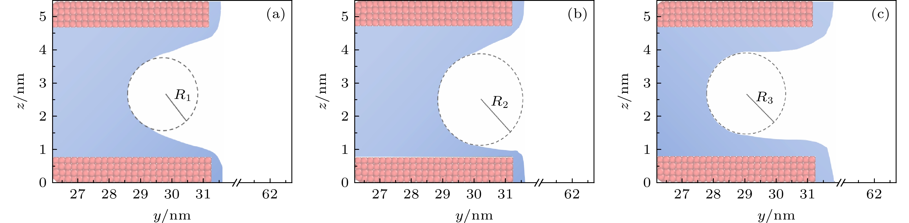 图 16 不同固-液相互作用强度下弯液面的几何轮廓及其曲率半径 (a) $ {\varepsilon }_{\mathrm{s}\mathrm{l}}={\varepsilon }_{\mathrm{l}\mathrm{l}} $; (b) $ {\varepsilon }_{\mathrm{s}\mathrm{l}}={2\varepsilon }_{\mathrm{l}\mathrm{l}} $; (c) $ {\varepsilon }_{\mathrm{s}\mathrm{l}}=4{\varepsilon }_{\mathrm{l}\mathrm{l}} $