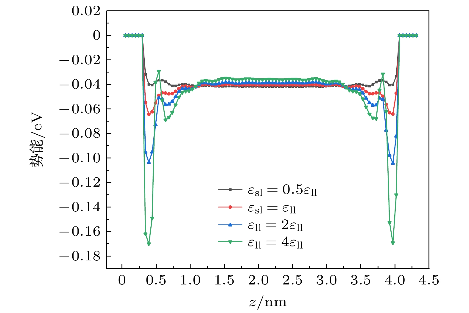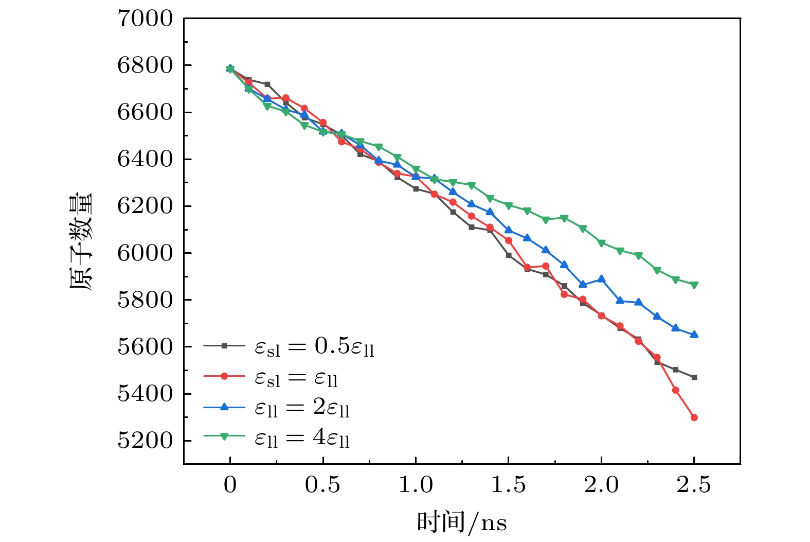 强度$ {\varepsilon }_{\mathrm{s}\mathrm{l}} $R/nm $ \gamma $/(mN·m–1) $ {P}_{\mathrm{c}} $/bar $ {P}_{\mathrm{v}} $/bar $ {P}_{\mathrm{l}} $/bar $ {\varepsilon }_{\mathrm{l}\mathrm{l}} $ 1.25 9.15 73.20 3.22 –69.98 2$ {\varepsilon }_{\mathrm{l}\mathrm{l}} $ 1.23 9.3 75.61 2.82 –72.79 4$ {\varepsilon }_{\mathrm{l}\mathrm{l}} $ 1.24 9.24 74.52 2.99 –71.53 -