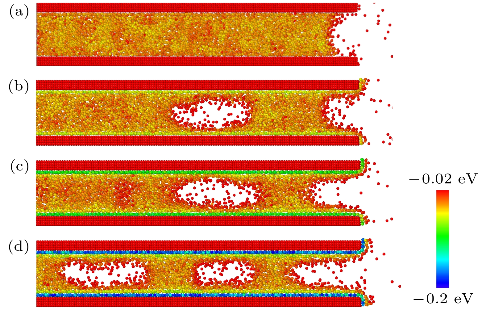 图 8 固-液相互作用强度为$ {\varepsilon }_{\mathrm{s}\mathrm{l}}=0.5{\varepsilon }_{\mathrm{l}\mathrm{l}} $时, 对应时刻(a)通道内液氩的状态, 以及(b)通道内液氩压力沿通道长度方向的分布