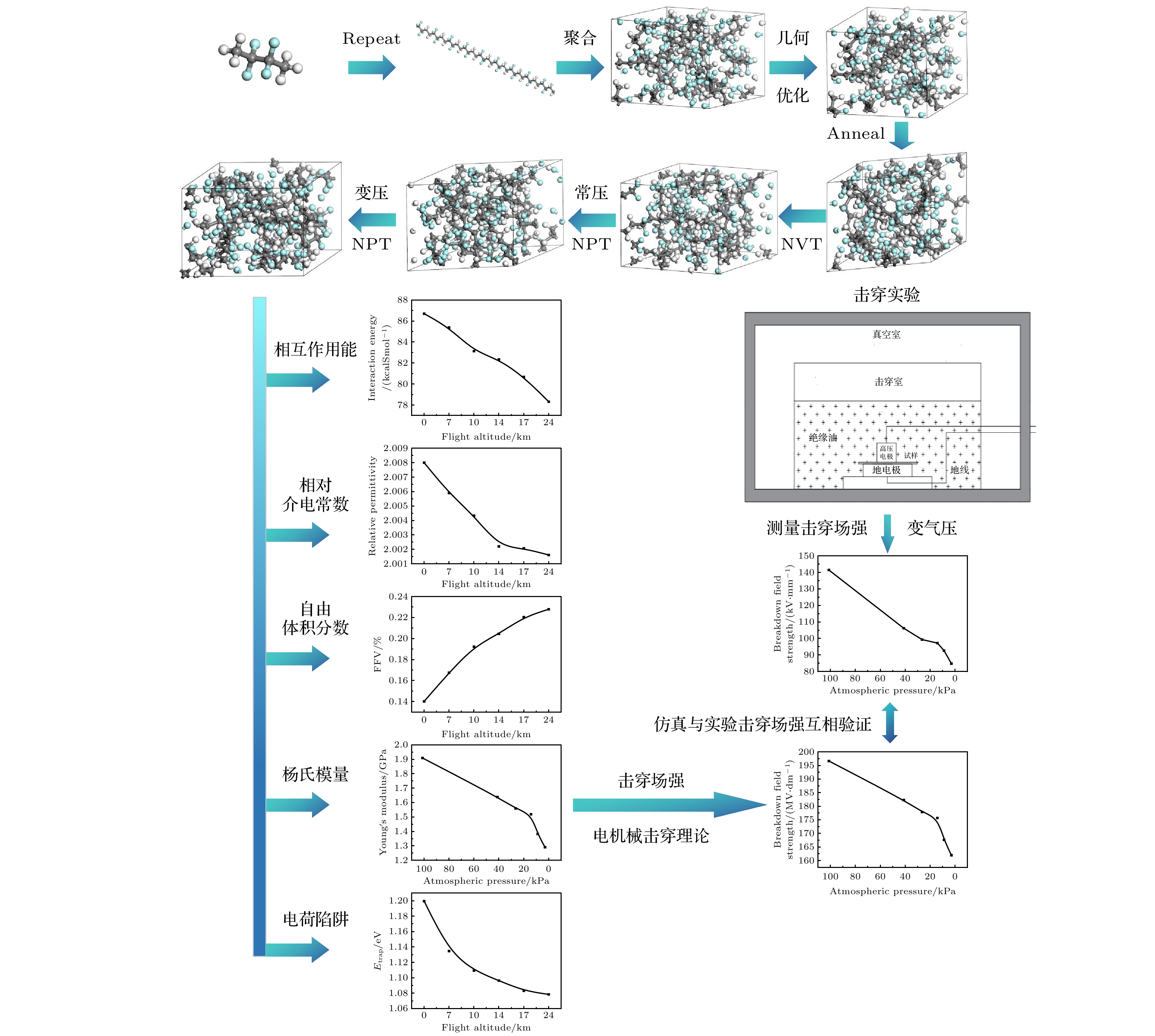 By studying the breakdown performance of ethylene-tetrafluoroethylene copolymer (ETFE) under low pressure via molecular dynamics simulations, and verifying the simulation results through low-pressure breakdown experiments, the insulation failure mechanism of ETFE materials under low pressure can be revealed on an atomic scale. First, molecular dynamics simulations are performed on ETFE. As the flight altitude gradually increases from 0 km to 24 km, the simulated pressure decreases from 101.300 kPa to 2.951 kPa. Correspondingly, the intermolecular distance increases by 9.692%, the interchain interaction energy decreases by 8.383%, the free volume fraction of ETFE increases by 65.000%, and the density of ETFE decreases by 7.737%. Subsequently, based on the electromechanical breakdown theory, it is deduced that the breakdown field strength of ETFE decreases by 17.626%. Finally, the low-pressure breakdown experiment shows that the breakdown field strength decreases by 40.078%, and the density measurement test indicates that the density decreases by 1.574%. Both simulation and experimental results confirm that the breakdown field strength of ETFE decreases with the reduction of pressure. This is because under low-pressure conditions, the increase in free volume fraction and the decrease in air density provide a longer mean free path for free electrons; the decrease in Young’s modulus leads to greater deformation under the same voltage, resulting in a higher applied field strength; the decrease in charge trap level weakens the charge trapping capability, leading to a higher concentration of free electrons. All these factors contribute to the reduction of the breakdown field strength of ETFE. This study provides performance prediction and failure mechanism analysis for the application of ETFE in aerospace and high-altitude extreme environments, and has guiding significance for the optimal design of aerospace insulation ETFE materials.