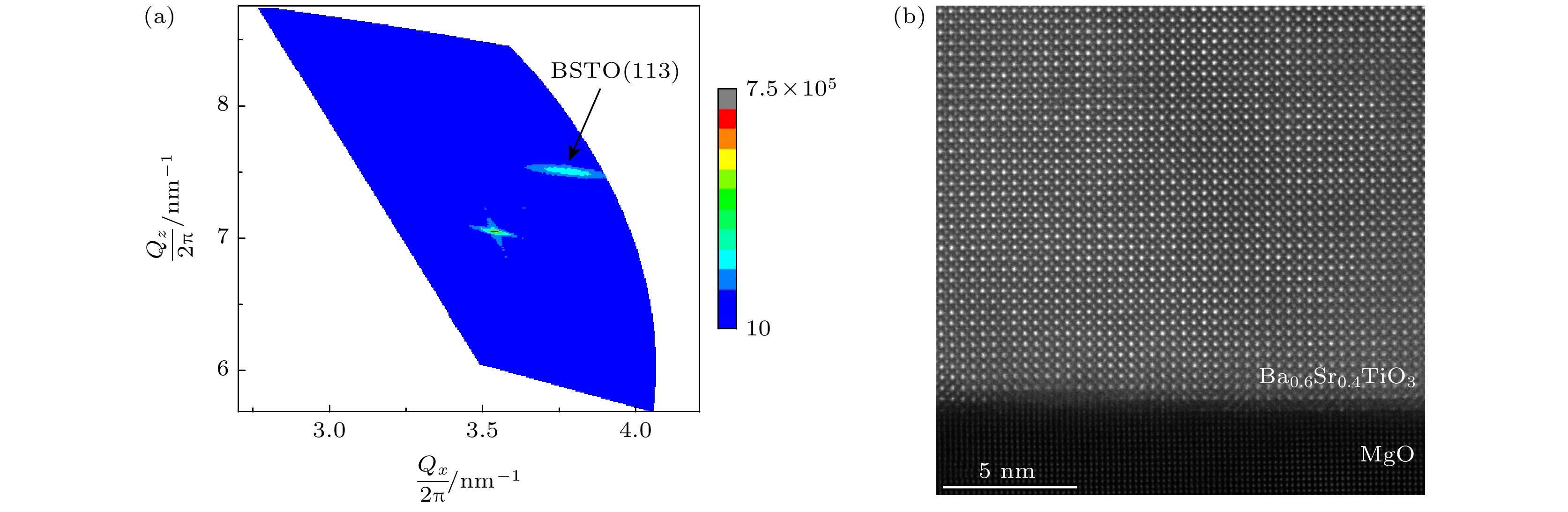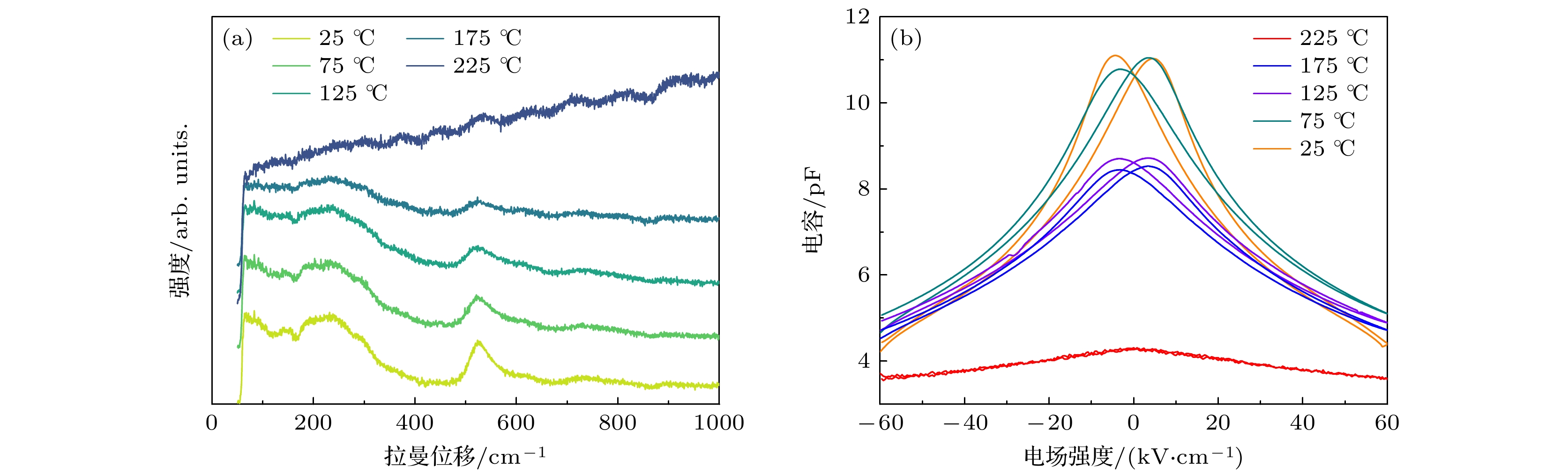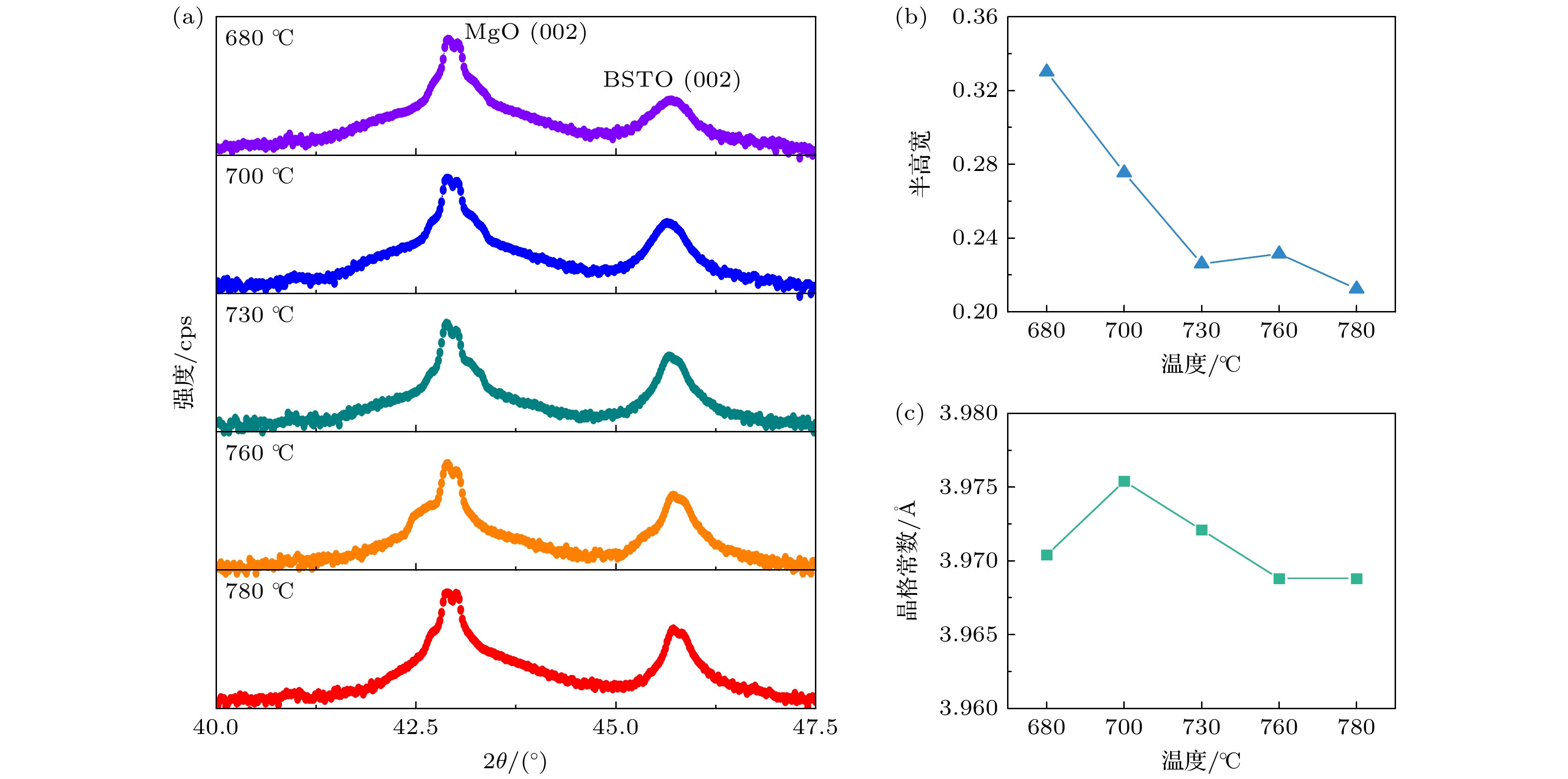 Microwave tunable devices are critical components in phased array antennas and RF front-ends, and essential for the precise controling of frequency, phase and amplitude. Although bulk dielectric ceramic materials are widely used in these devices, they pose challenges for integration. In contrast, dielectric thin films offer significant advantages, including easy integration, low cost, high tuning speed, low power consumption, compact size, and continuous tunability, making them more compatible with modern integrated circuit fabrication processes. Currently, a key prerequisite for designing devices based on dielectric thin films is the use of low-permittivity, low-loss substrates to mitigate their influence on the overall dielectric performance, while enhancing the crystalline quality of the films themselves. However, suitable substrates for epitaxial growth, such as MgO and Si, exhibit a significant lattice mismatch (>5%) with dielectric thin films. This poses a substantial challenge to achieving high-quality epitaxial growth, making it difficult to obtain dielectric thin films with both high tunability and low loss. To address this challenge, pulsed laser deposition (PLD) is used to provide high-energy, non-equilibrium growth conditions. By precisely controlling parameters such as substrate temperature and growth oxygen pressure, a suitable growth window that induce domain matching epitaxy (DME) mechanism can be determined, effectively adapting to mismatched strain, and thus successfully preparing high-performance Ba0.6Sr0.4TiO3 (BSTO) epitaxial thin films on MgO(001) substrates. To investigate the effect of substrate temperature on the properties of the BSTO thin films, a series of films is prepared on MgO(001) substrates at temperatures of 680 ℃, 700 ℃, 730 ℃, 760 ℃ and 780 ℃, while other growth conditions are kept constant. The study reveals that as the substrate temperature increases, the crystallinity, tunability, and figure of merit (FOM) of the films are significantly improved. The film grown at 780 ℃ shows a high tunability value of 67.2%, a quality (Q) factor of 49, and an FOM of 32.93. Compared with previously reported films, the Ba0.6Sr0.4TiO3 thin films prepared in this work demonstrate superior dielectric tunability and lower dielectric loss. To explore the thermal stability of the Ba0.6Sr0.4TiO3 thin film, its performance is characterized using Raman spectroscopy and Capacitance-Voltage measurements in a temperature range from 25 ℃ to 225 ℃. Raman spectra indicate that the lattice vibrational modes of the Ba0.6Sr0.4TiO3 film change with the increase of temperature. When temperature is in a range between 175 ℃ and 225 ℃, the film will completely transform from the tetragonal phase to the Raman-inactive cubic phase. At the same time, the nonlinear “butterfly” characteristic of the C-V curves vanishes due to the disappearance of ferroelectric domains. The dielectric constant and tunability reach their maximum values at approximately 60 ℃, then decrease, whereas the Q-factor reaches its peak at around 205 ℃. The motion of domain walls in films is constrained not only by internal stress fields and defects but also by strong pinning effects at the film-substrate interface and the free surface of the film. This research systematically analyzes the influences of surface morphology, crystal structure, and temperature on the dielectric properties of Ba0.6Sr0.4TiO3 epitaxial thin films. It lays a foundation for elucidating the broadband structure-property relationships of Ba1–xSrxTiO3 thin films and highlights their significant potential applications in tunable microwave devices. -