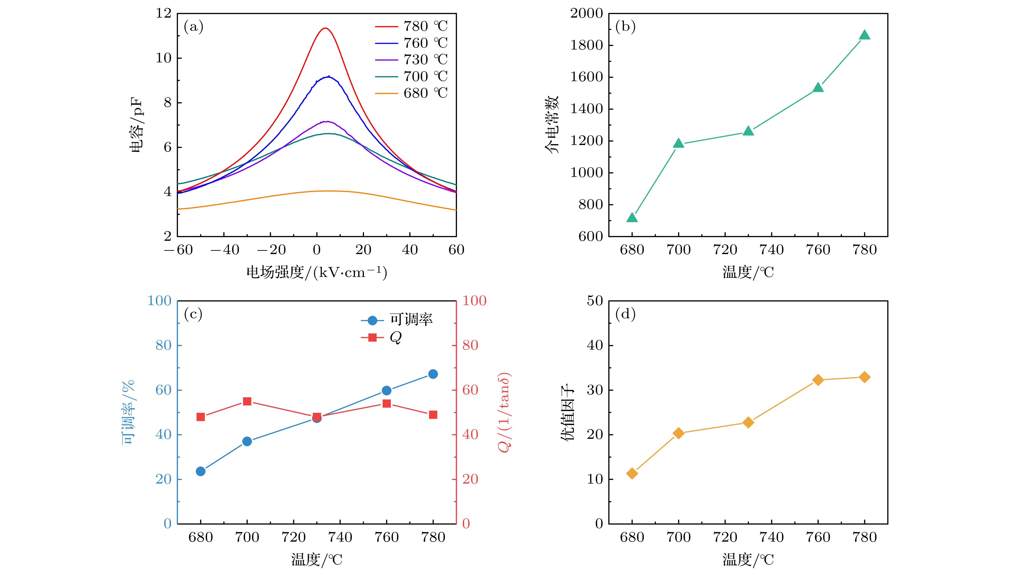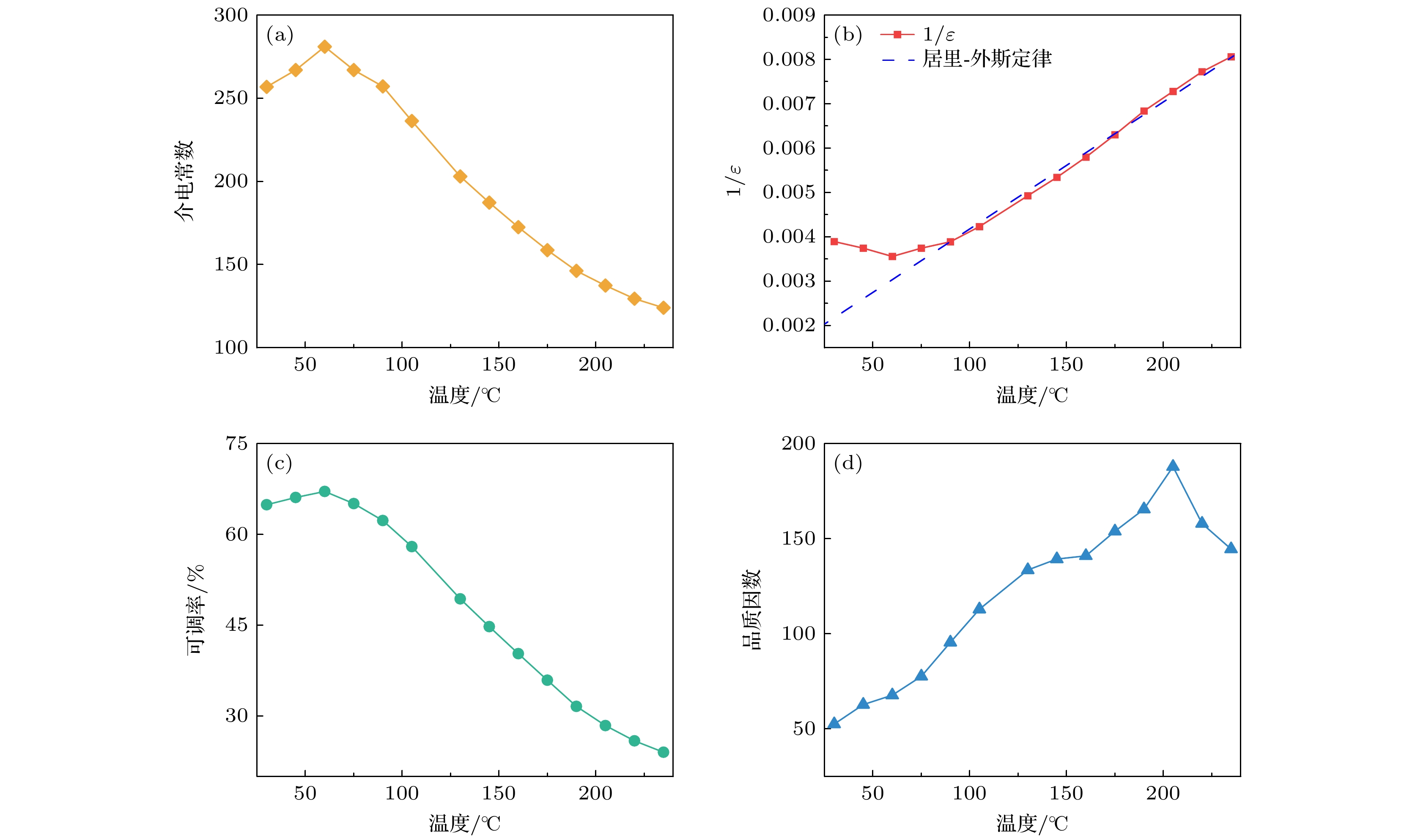 Figure 8. Temperature-dependent dielectric properties of Ba0.6Sr0.4TiO3 thin films: (a) Dielectric constant (at 0 kV/cm); (b) $ 1/\varepsilon{\text{-}}T $ and Curie-Weiss law curves; (c) tunability; (d) Q factor.
