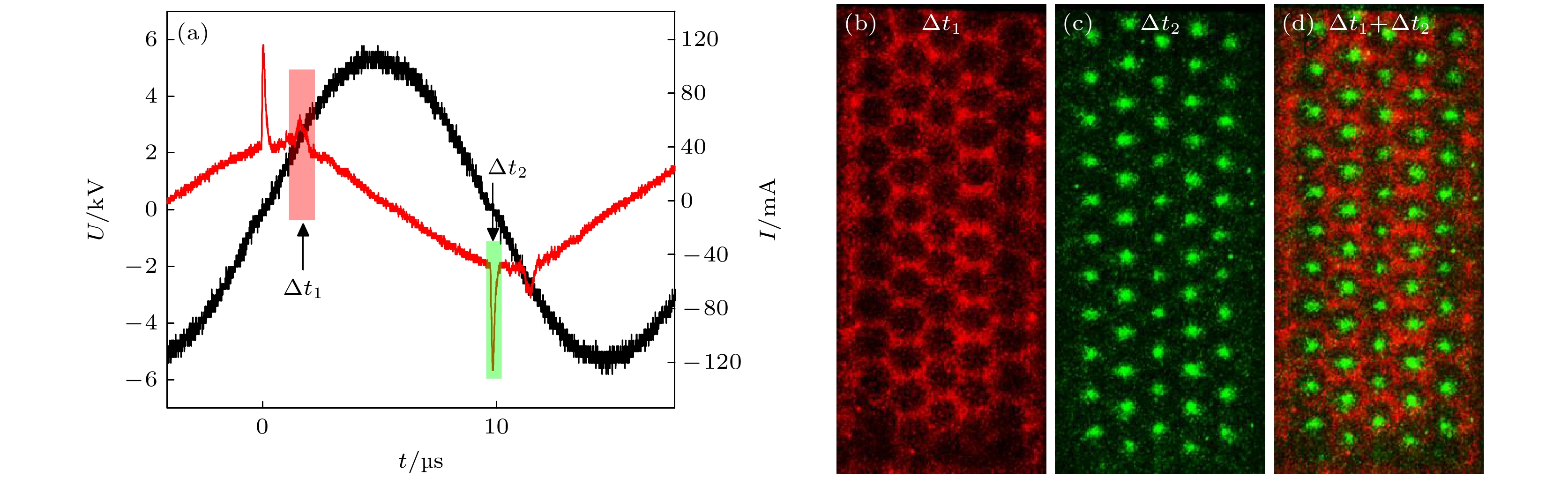 Figure 3. Instantaneous images of the quasi honeycomb superlattice pattern: (a) Waveforms of the voltage and the current. (Δt1 = 1440 ns, Δt2 = 640 ns); (b), (c) images exposed corresponding to the current pulse phases denoted by Δt1 and Δt2 in panel (a), respectively, and the images are integrated for 100 voltage cycles; (d) superposition of panels (b), (c).