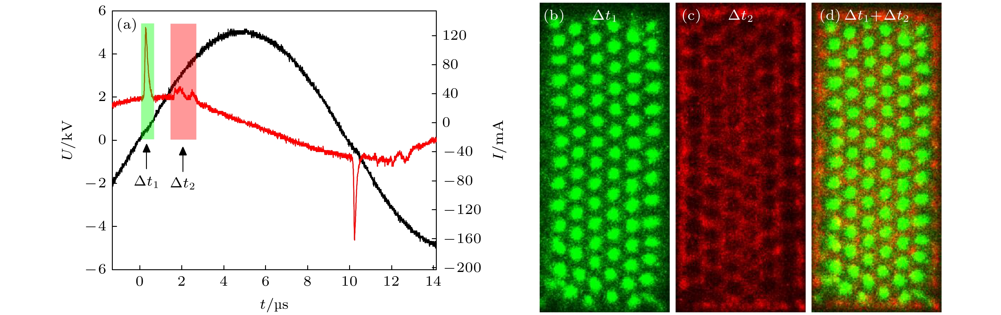 Figure 5. Instantaneous images of the honeycomb superlattice pattern: (a) Waveforms of the voltage and the current. (Δt1 = 560 ns, Δt2 = 2000 ns); (b), (c) images exposed corresponding to the current pulse phases denoted by ∆t1 and ∆t2 in (a), respectively, and the images are integrated for 100 voltage cycles; (d) superposition of panels (b), (c).