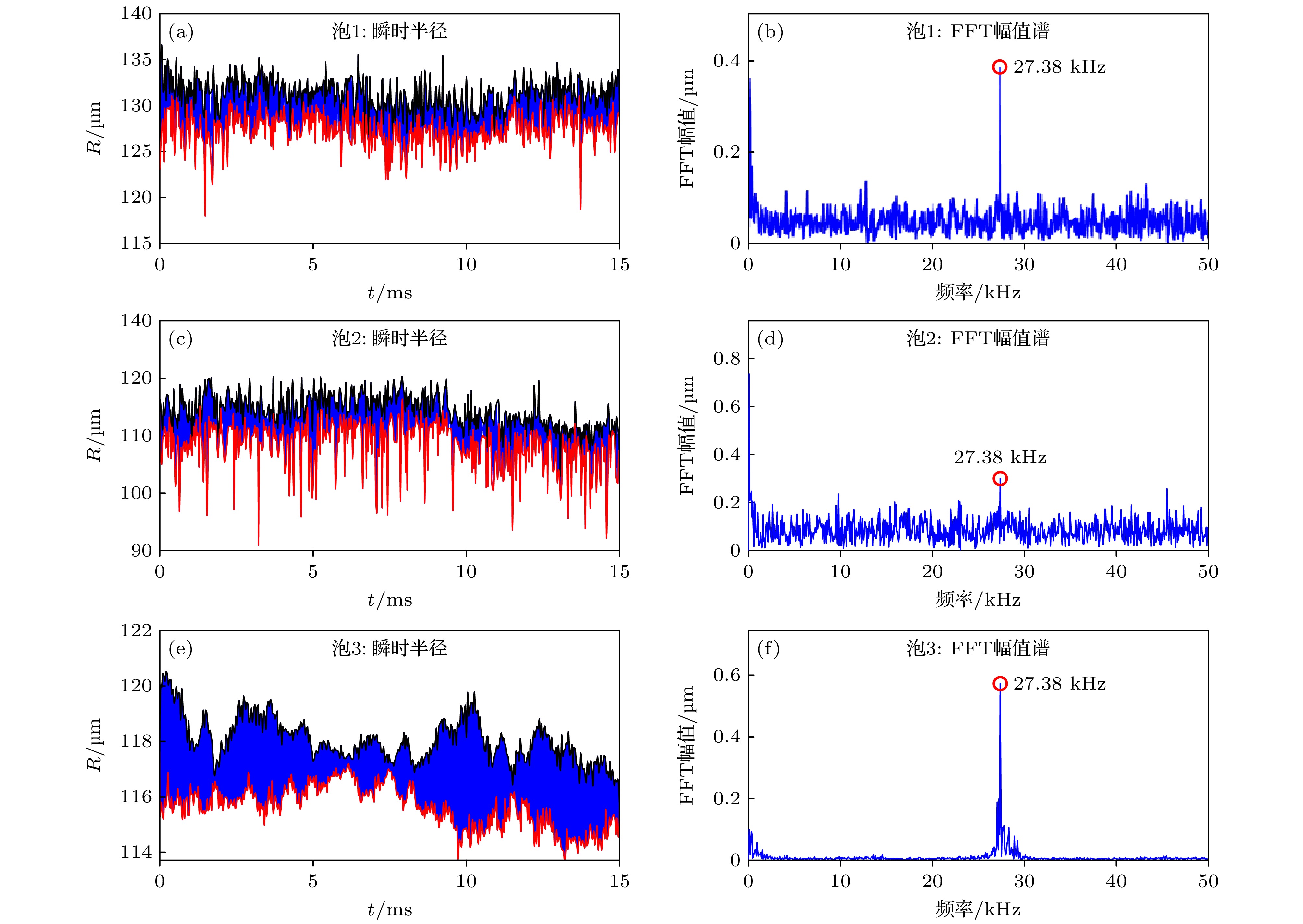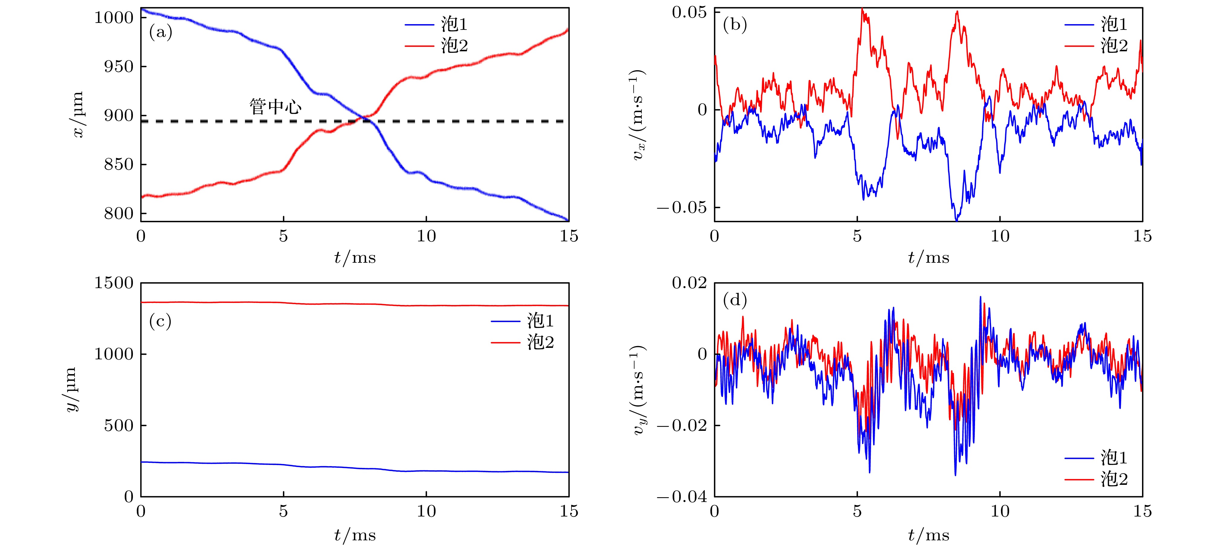 图 13 理论模型与实验对照 (a) 单泡模型图($ {R_{10}} = 142.7 \;{\text{μm}} $, $ {l_{{1 \text{a}}}} = 575.8 \;{\text{μm}} $, $ {l_{{1 \text{b}}}} = 424.2 \;{\text{μm}} $, $ \left( {{x_1}, {y_1}} \right) =\left( 893.9 \;{\text{μm}}, $$ 833.3 \;{\text{μm}} \right) $); (b) 双泡模型图($ {R_{10}} = 157.5 \;{\text{μm}} $, $ {R_{20}} = 159.6 \;{\text{μm}} $, $ {l_{{1 \text{a}}}} = 575.8 \;{\text{μm}}$, $ {l_{{1 \text{b}}}} = 424.2 \;{\text{μm}} $, $ {l_{2{\text{a}}}} = 393.9 \;{\text{μm}} $, $ {l_{{2 \text{b}}}} = $$ 606.1 \;{\text{μm}} $, $ {D_{12}} = 1136.4 \;{\text{μm}} $, $ \left( {{x_1}, {y_1}} \right) = \left( {814.7 \;{\text{μm}}, 1363.6 \;{\text{μm}}} \right) $, $ \left( {{x_2}, {y_2}} \right) = \left( {1009.9 \;{\text{μm}}, 242.4 \;{\text{μm}}} \right) $); (c) 单泡振荡特性; (d) 单泡平动特性; (e) 双泡振荡特性; (f) 双泡平动特性