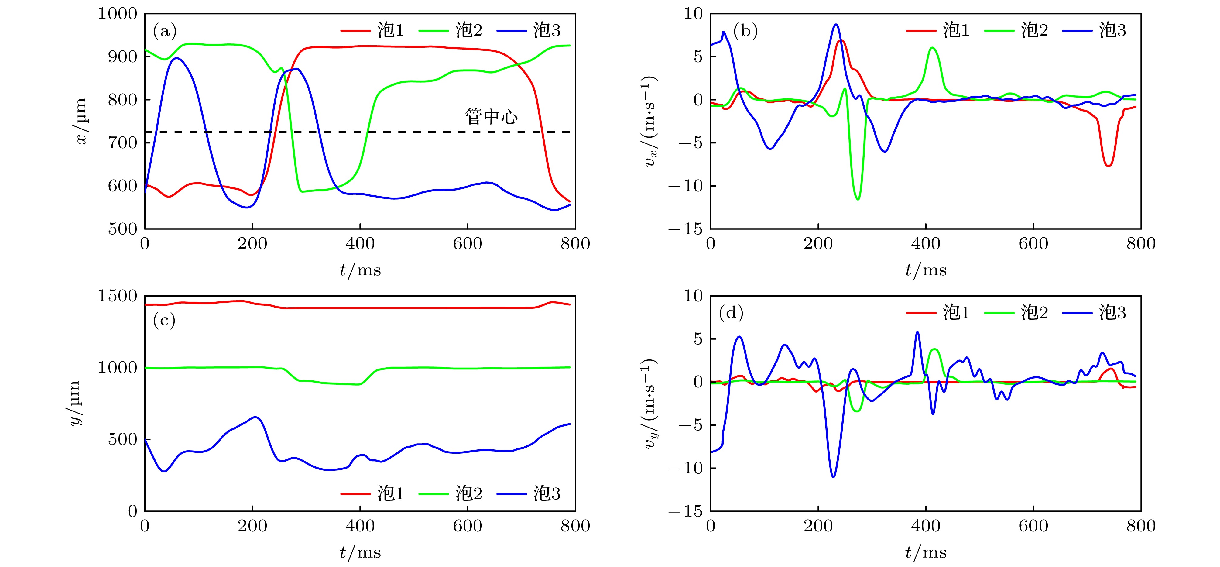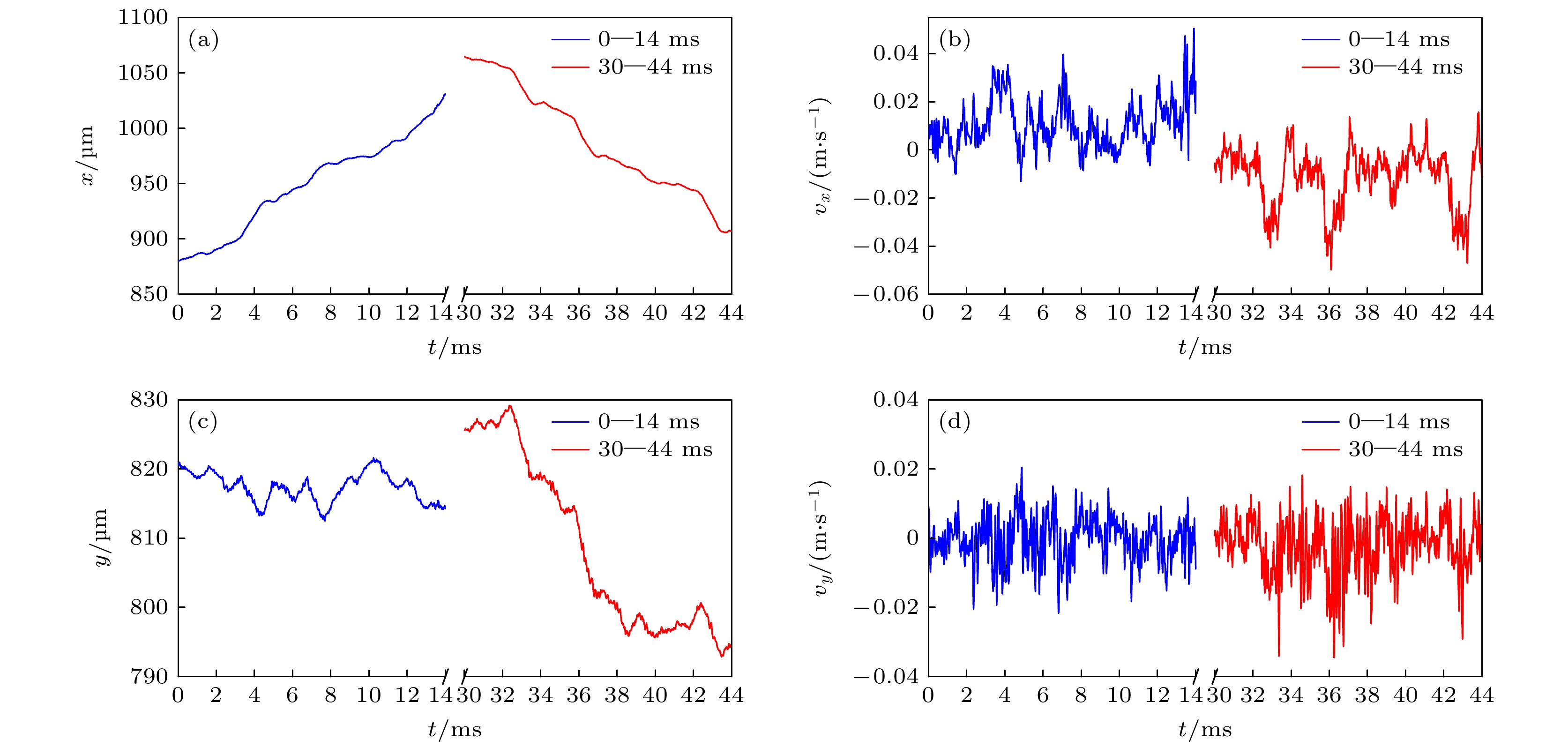 图 5 不同时段单泡平动行为 (a) 0—14 ms时段x方向位移; (b) 0—14 ms时段x方向速度; (c) 30—44 ms时段y方向位移; (d) 30—44 ms时段y方向速度