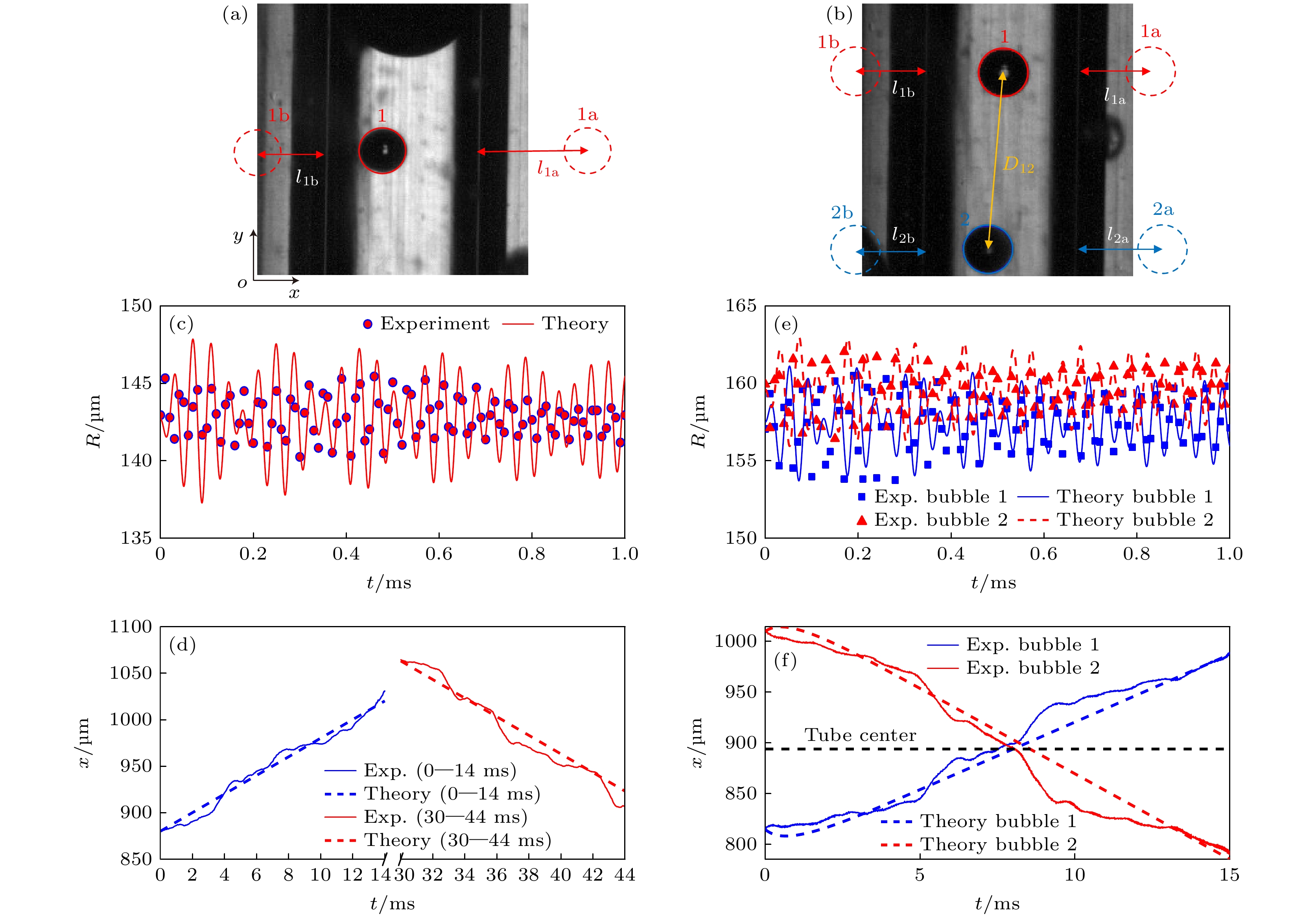 Figure 13. Comparison between theoretical model and experimental results: (a) Single-bubble model ($ {R_{10}} = 142.7 \;{\text{μm}} $, $ {l_{{1 \text{a}}}} = 575.8 \;{\text{μm}} $, $ {l_{{1 \text{b}}}} = 424.2 \;{\text{μm}} $, $ \left( {{x_1}, {y_1}} \right) = \left( {893.9 \;{\text{μm}}, 833.3 \;{\text{μm}}} \right) $); (b) dual-bubble model ($ {R_{10}} = 157.5 \;{\text{μm}} $, $ {R_{20}} = 159.6 \;{\text{μm}} $, $ {l_{{1 \text{a}}}} = 575.8 \;{\text{μm}} $, $ {l_{{1 \text{b}}}} = 424.2 \;{\text{μm}} $, $ {l_{2{\text{a}}}} = 393.9 \;{\text{μm}} $, $ {l_{{2 \text{b}}}} = 606.1 \;{\text{μm}} $, $ {D_{12}} = 1136.4 \;{\text{μm}} $, $ \left( {{x_1}, {y_1}} \right) = \left( {814.7 \;{\text{μm}}, 1363.6 \;{\text{μm}}} \right) $, $ \left( {{x_2}, {y_2}} \right) = \left( {1009.9 \;{\text{μm}}, 242.4 \;{\text{μm}}} \right) $); (c) single-bubble oscillation characteristics; (d) single-bubble translational behavior; (e) dual-bubble oscillation characteristics; (f) dual-bubble translational behavior.