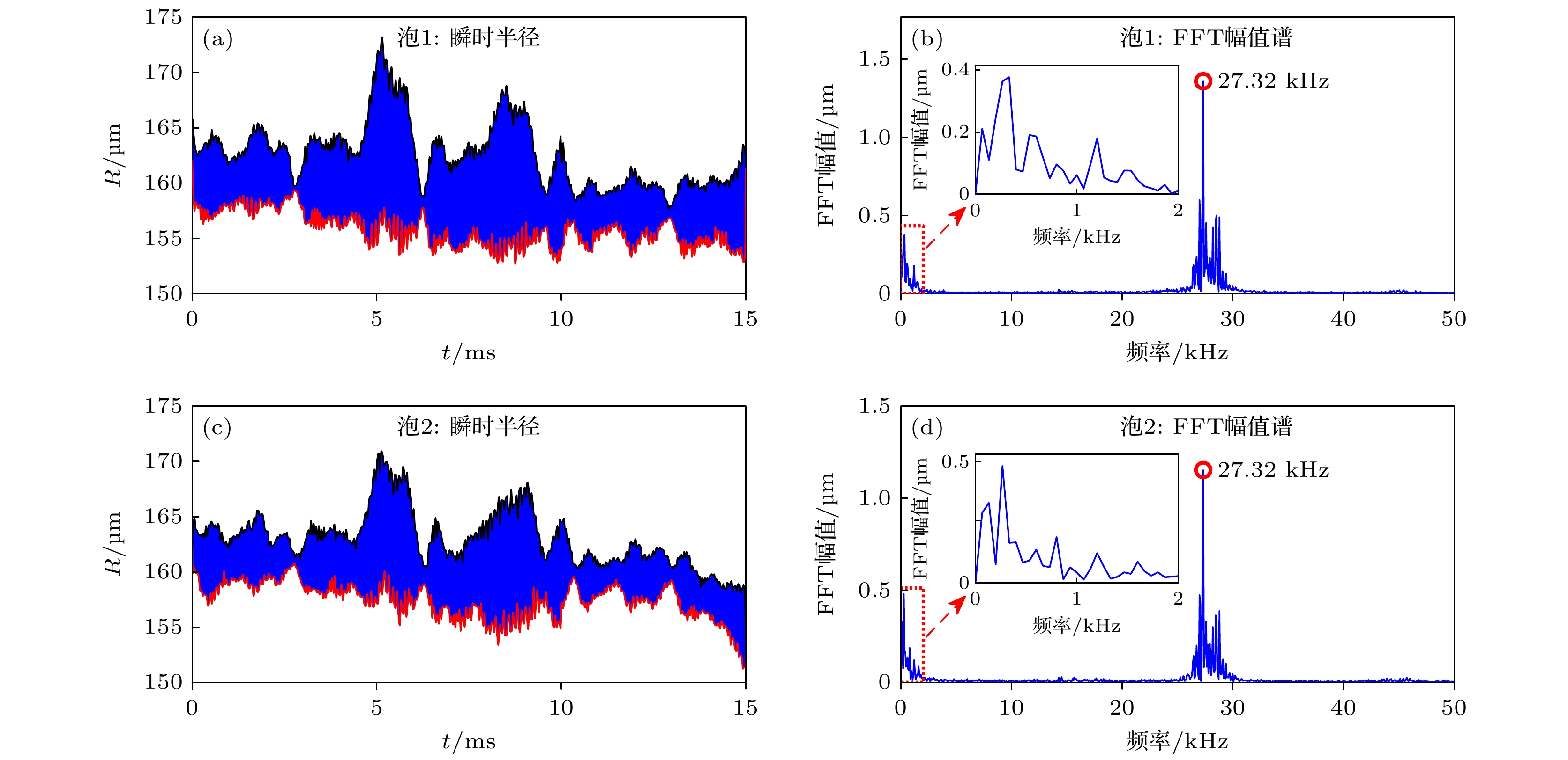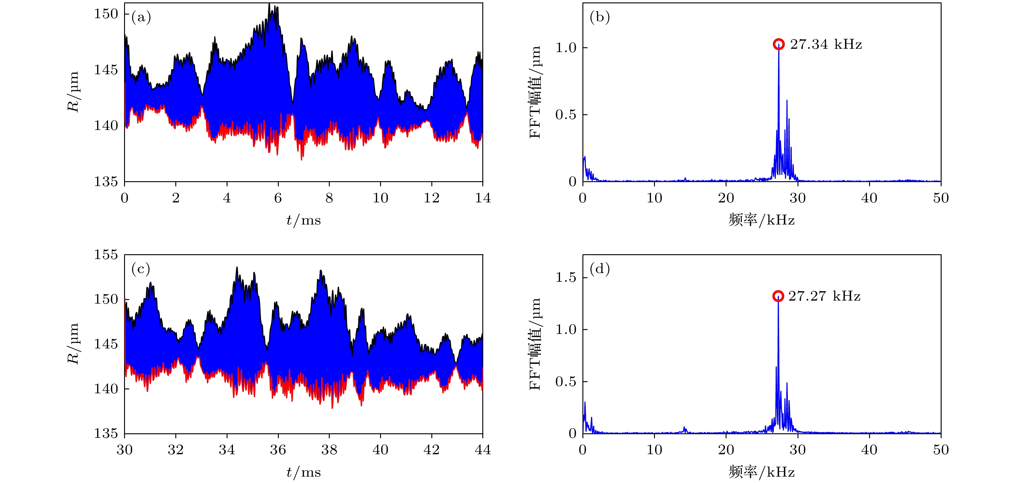 图 4 不同时段单泡振荡行为 (a) 0—14 ms半径时域变化; (b) 0—14 ms频谱分析; (c) 30—44 ms半径时域变化; (d) 30—44 ms频谱分析