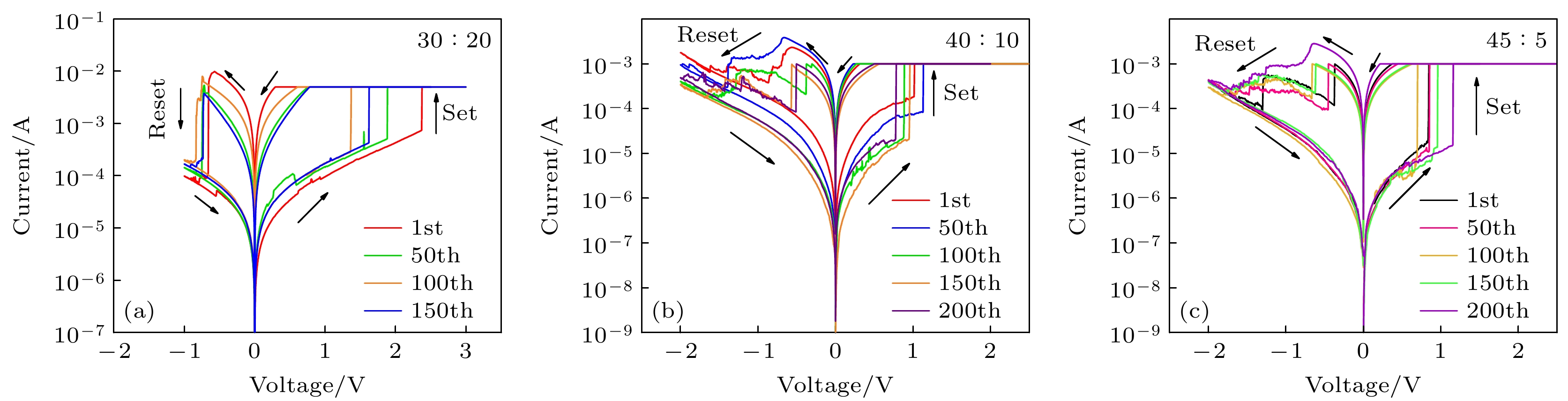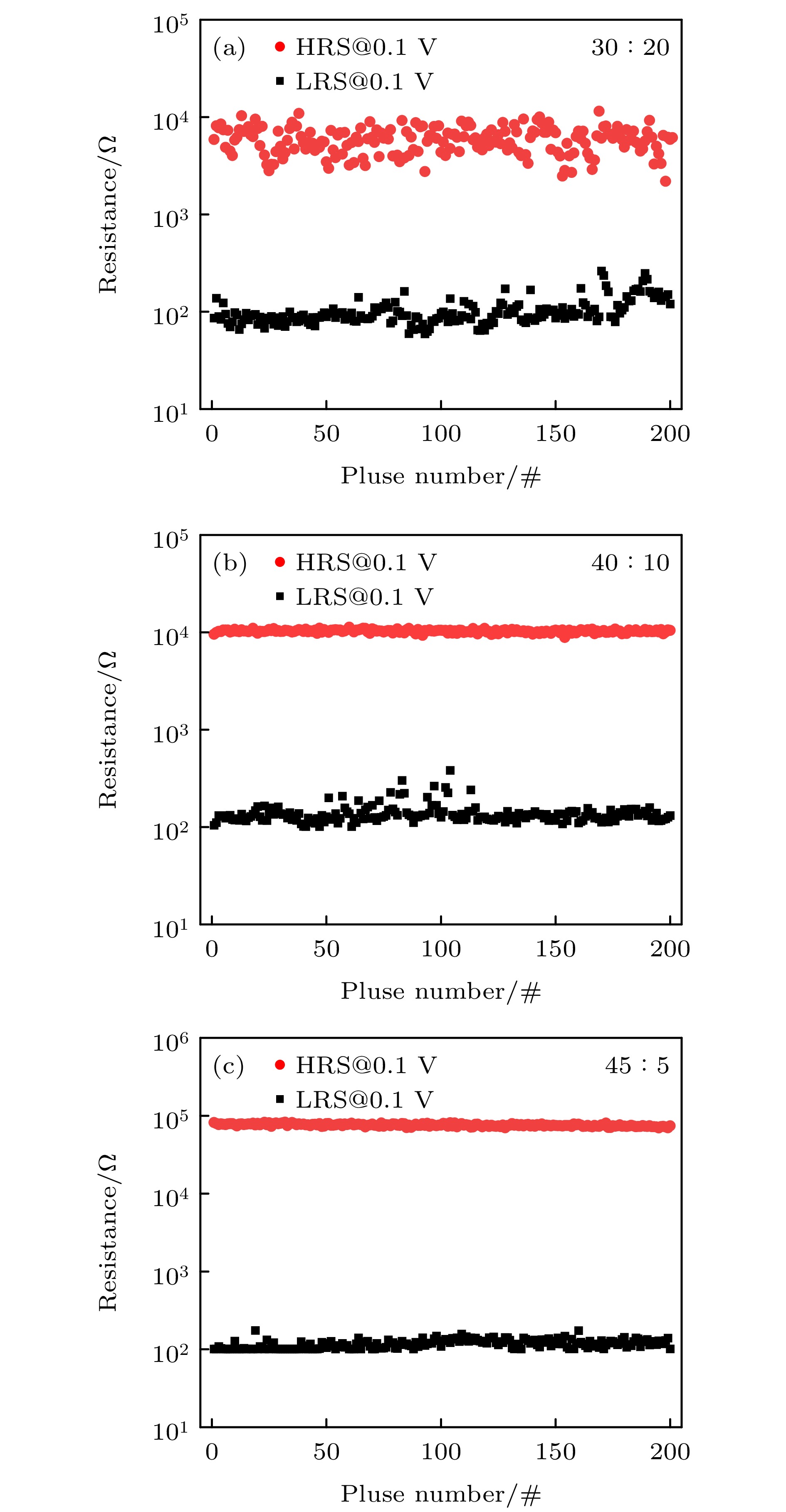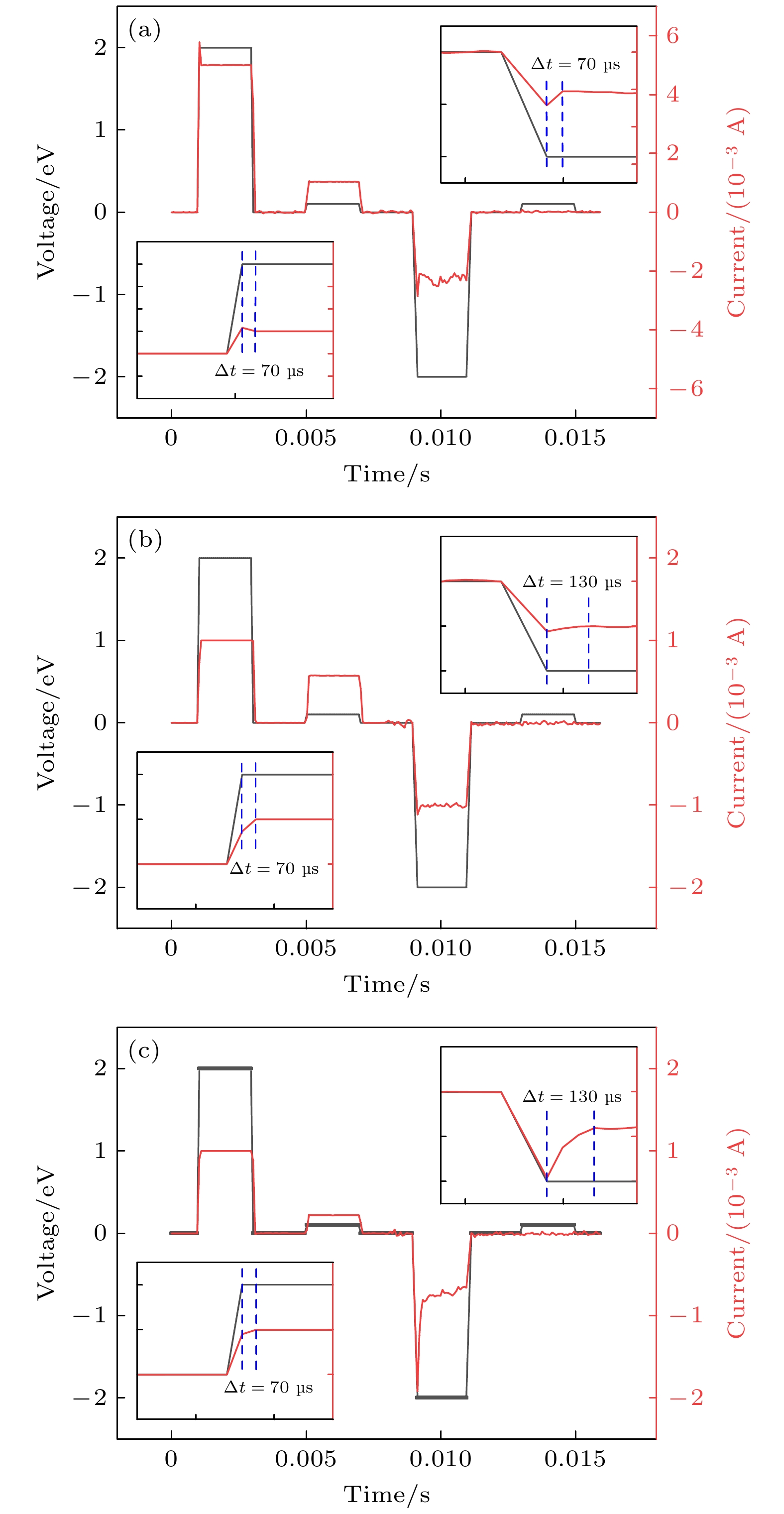 Figure 10. Pulse response time of the W/HfOx/Pt memristor (The black curve represents the set voltage, and the red curve represents the current measured from the device under electrical pulses): (a) The device with a ratio of 30∶20; (b) the device with a ratio of 40∶10; (c) the device with a ratio of 45∶5.