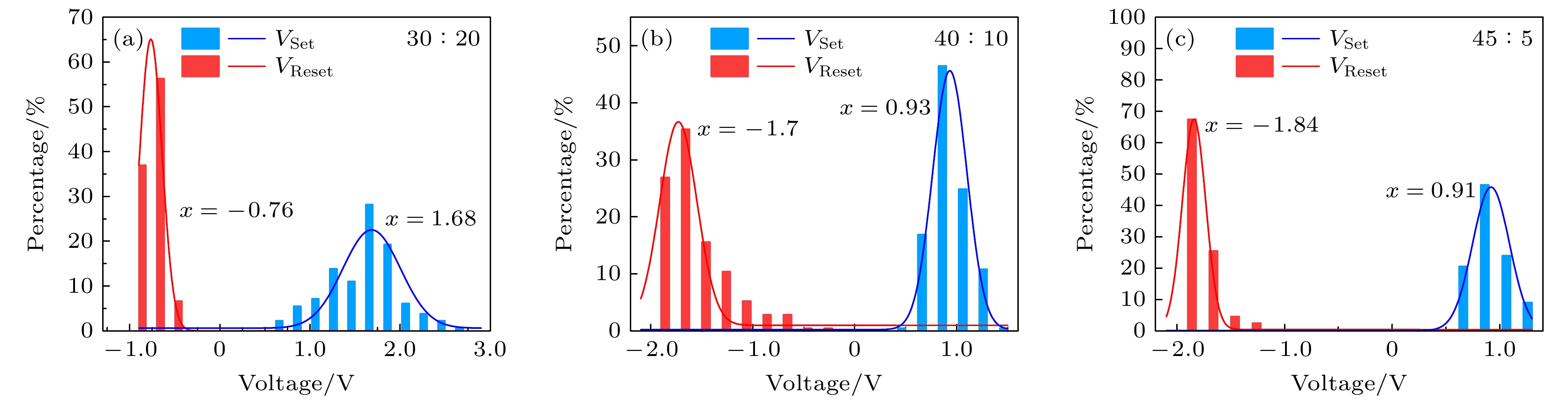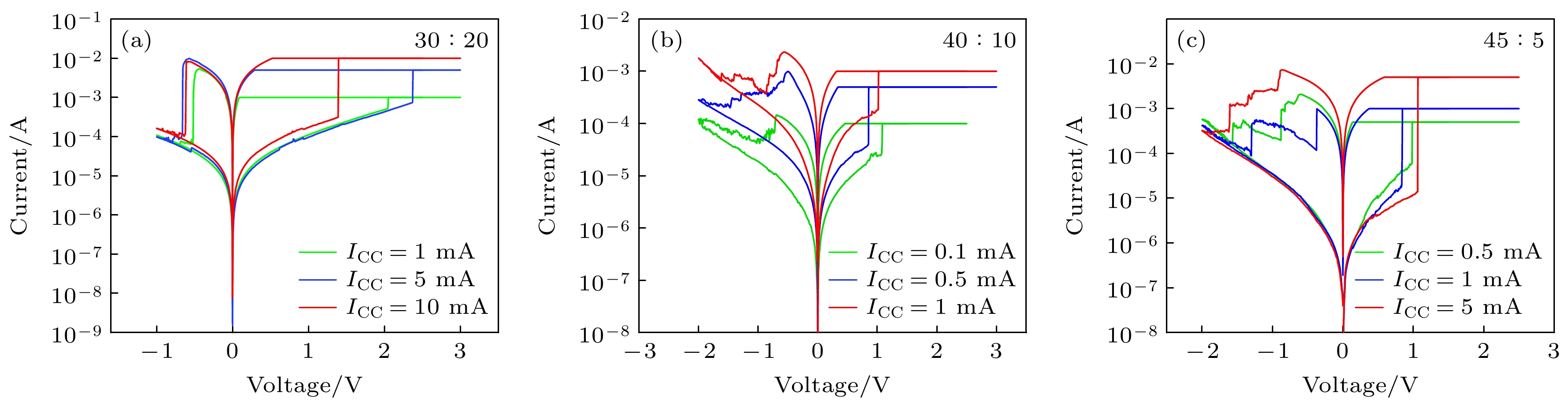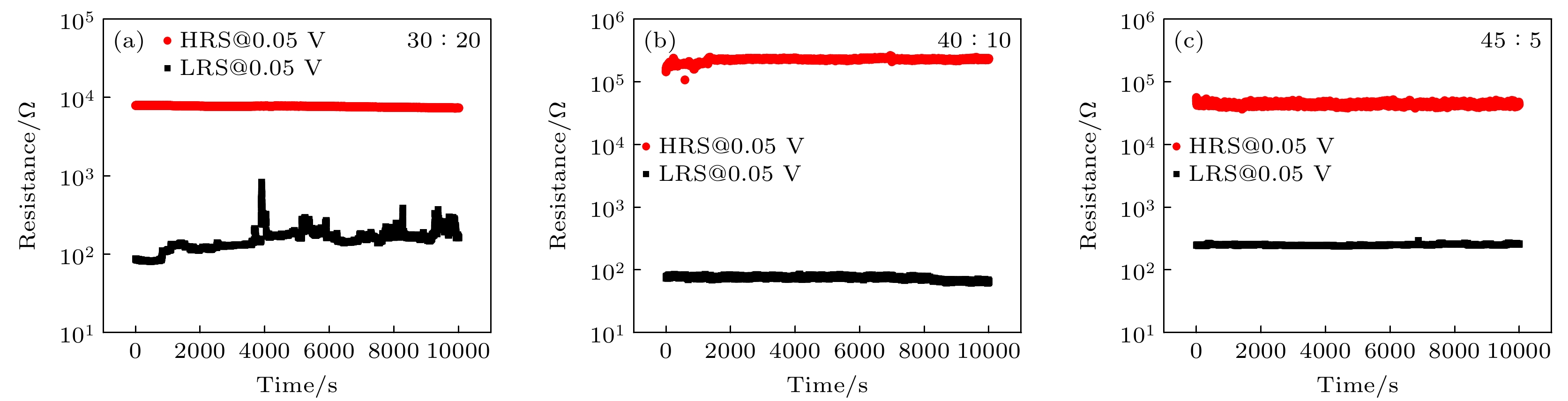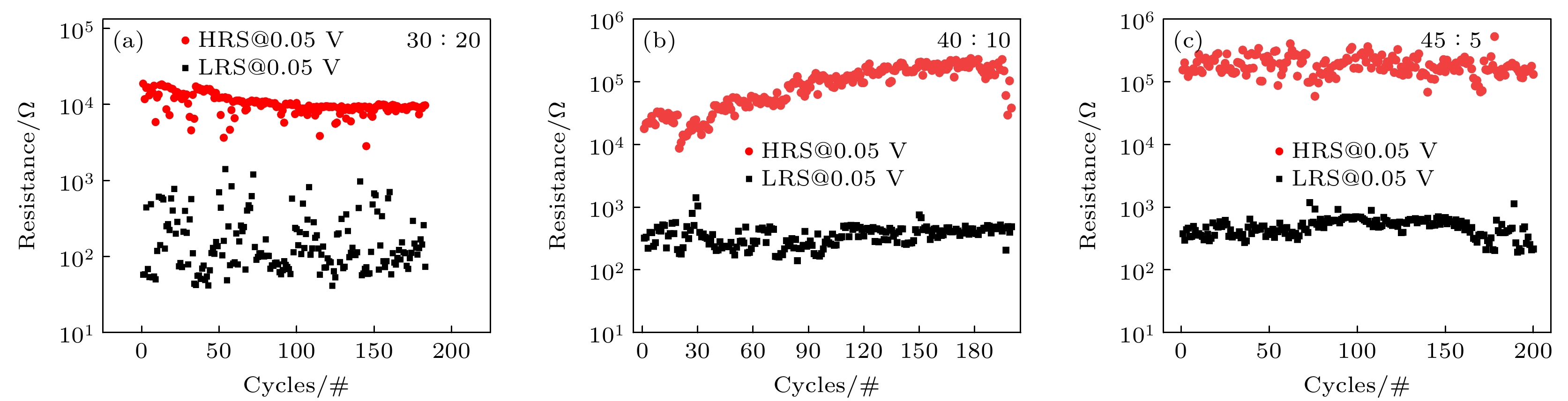 Figure 10. Pulse response time of the W/HfOx/Pt memristor (The black curve represents the set voltage, and the red curve represents the current measured from the device under electrical pulses): (a) The device with a ratio of 30∶20; (b) the device with a ratio of 40∶10; (c) the device with a ratio of 45∶5.