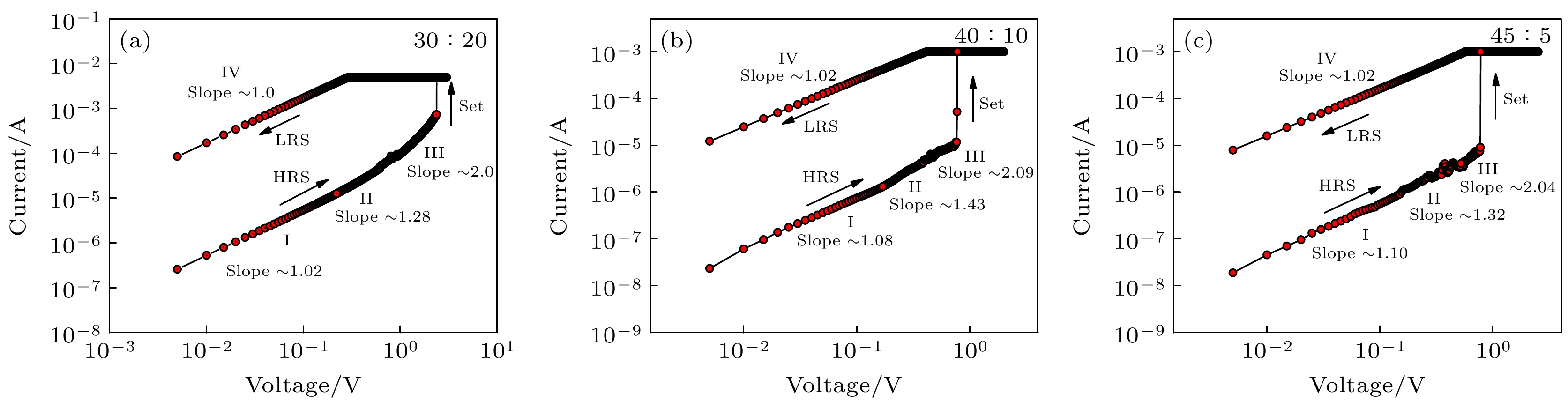 Figure 12. Conductive fitting mechanism of the W/HfOx/Pt memristor: (a) Double logarithmic fitting results of the I -V curve in the positive scanning region of the device with a ratio of 30∶20; (b) double logarithmic fitting results of the I -V curve in the positive scanning region of the device with a ratio of 40∶10; (c) double logarithmic fitting results of the I -V curve in the positive scanning region of the device with a ratio of 45∶5.