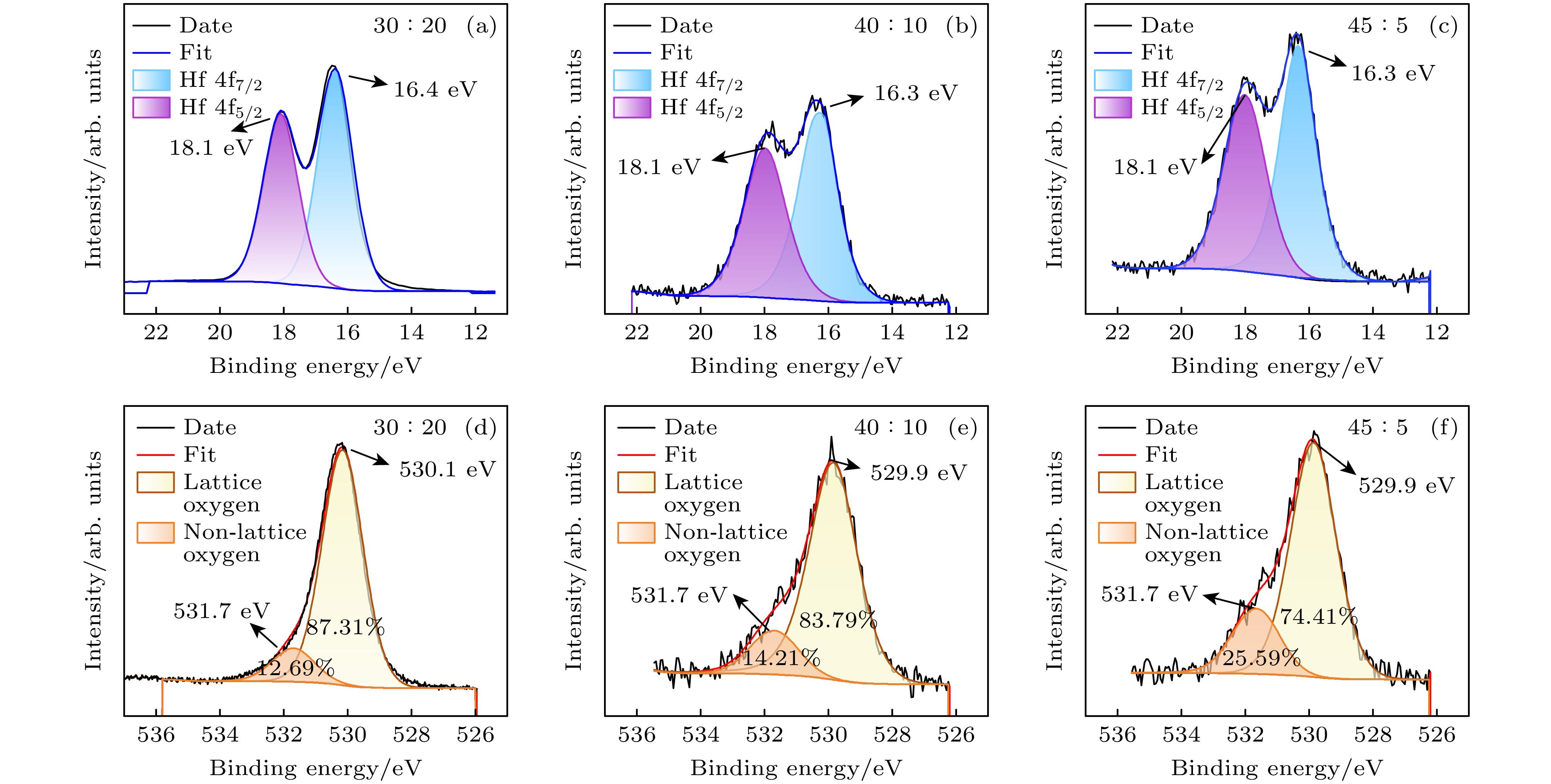 Figure 4. XPS spectra of the HfOx thin films: (a)–(c) Hf 4f core level spectrum with argon-to-oxygen ratios of (a) 30∶20, (b) 40∶10, (c) 45∶5; (d)–(f) O 1s core level spectrum with argon-to-oxygen ratios of (d) 30∶20, (e) 40∶10, (f) 45∶5.