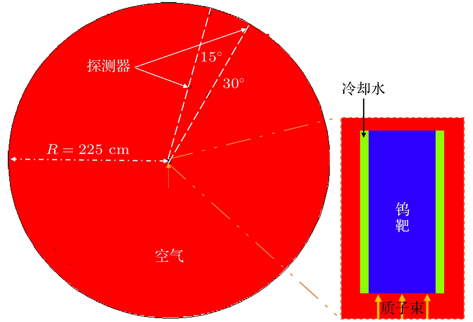 Figure 6. Source term assessment model and spatial distribution of neutron flux with En ≥ 10 MeV of ANIS based on CSNS-TMR: (a) Source term assessment model of ANIS in MCNPX; (b) spatial distribution of neutron flux with En ≥ 10 MeV.