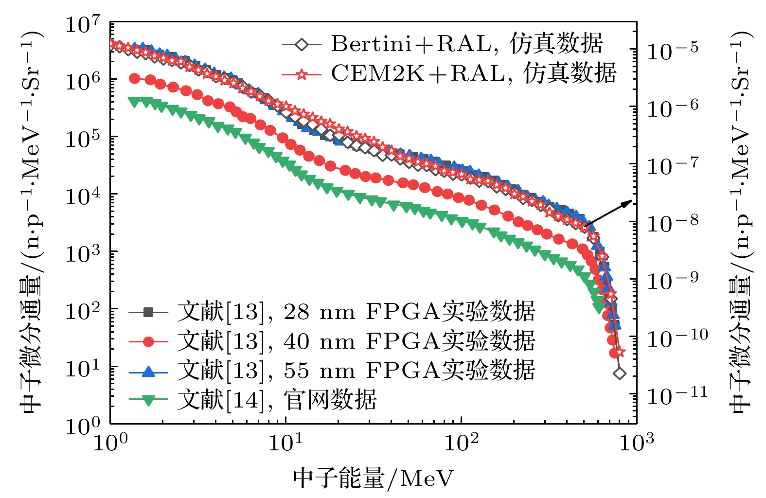 源 1—10 MeV 10—100 MeV >100 MeV IEC 62396-1 35 35 29 JESD89 A 35 35 30 QARM (model) 40 36 24 LANSCE WNR 52 26 22 TRIUMF TNF 24 54 21 CSNS ANIS 35 35 30 表 2 各装置相对于JESD89A参考大气中子引起的辐射效应差异对比