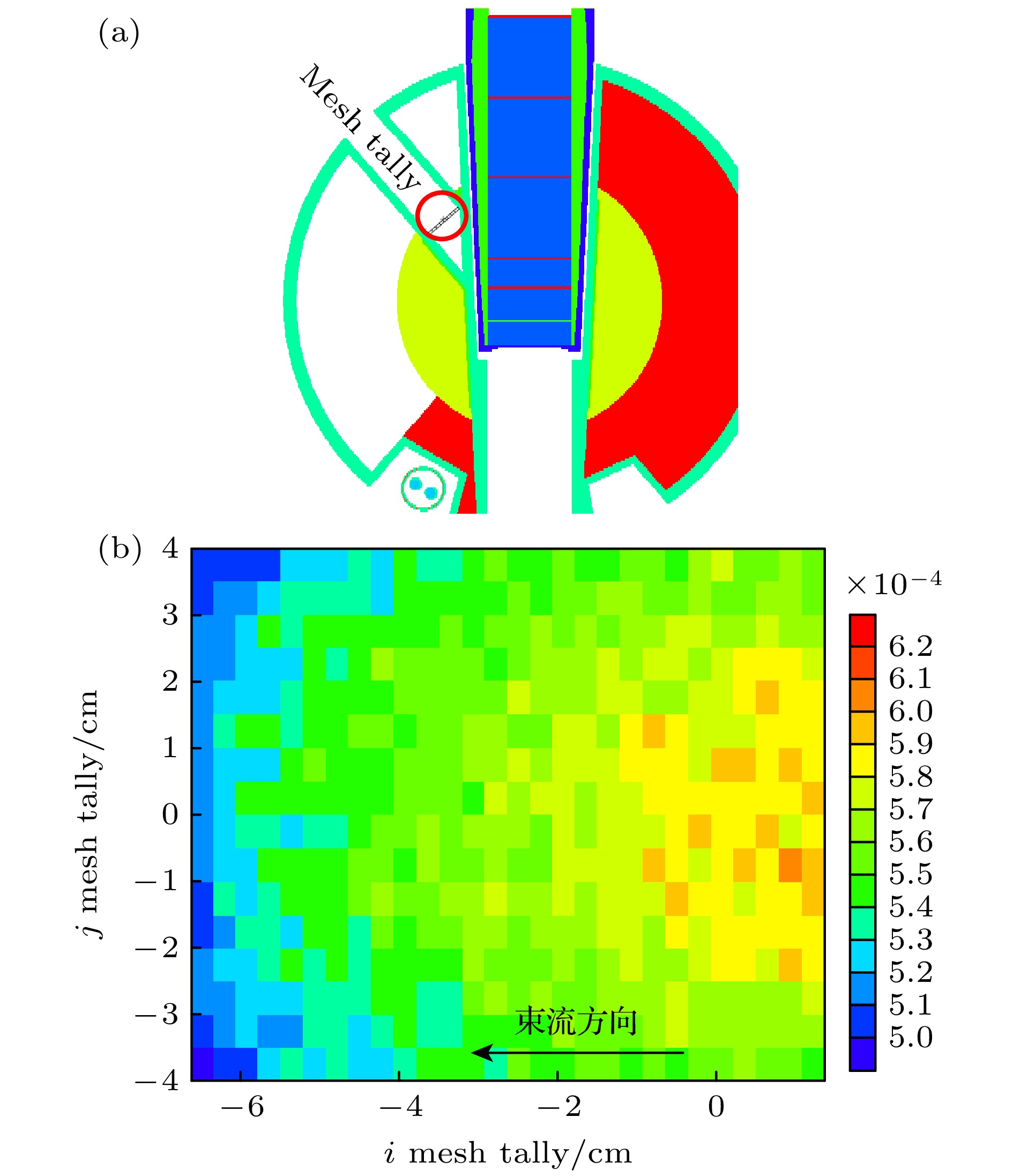 图 6 基于TMR模型的ANIS引出孔道En ≥ 10 MeV中子注量评估模型和空间分布 (a) MCNPX ANIS源项评估计算模型; (b) En ≥ 10 MeV中子注量空间分布