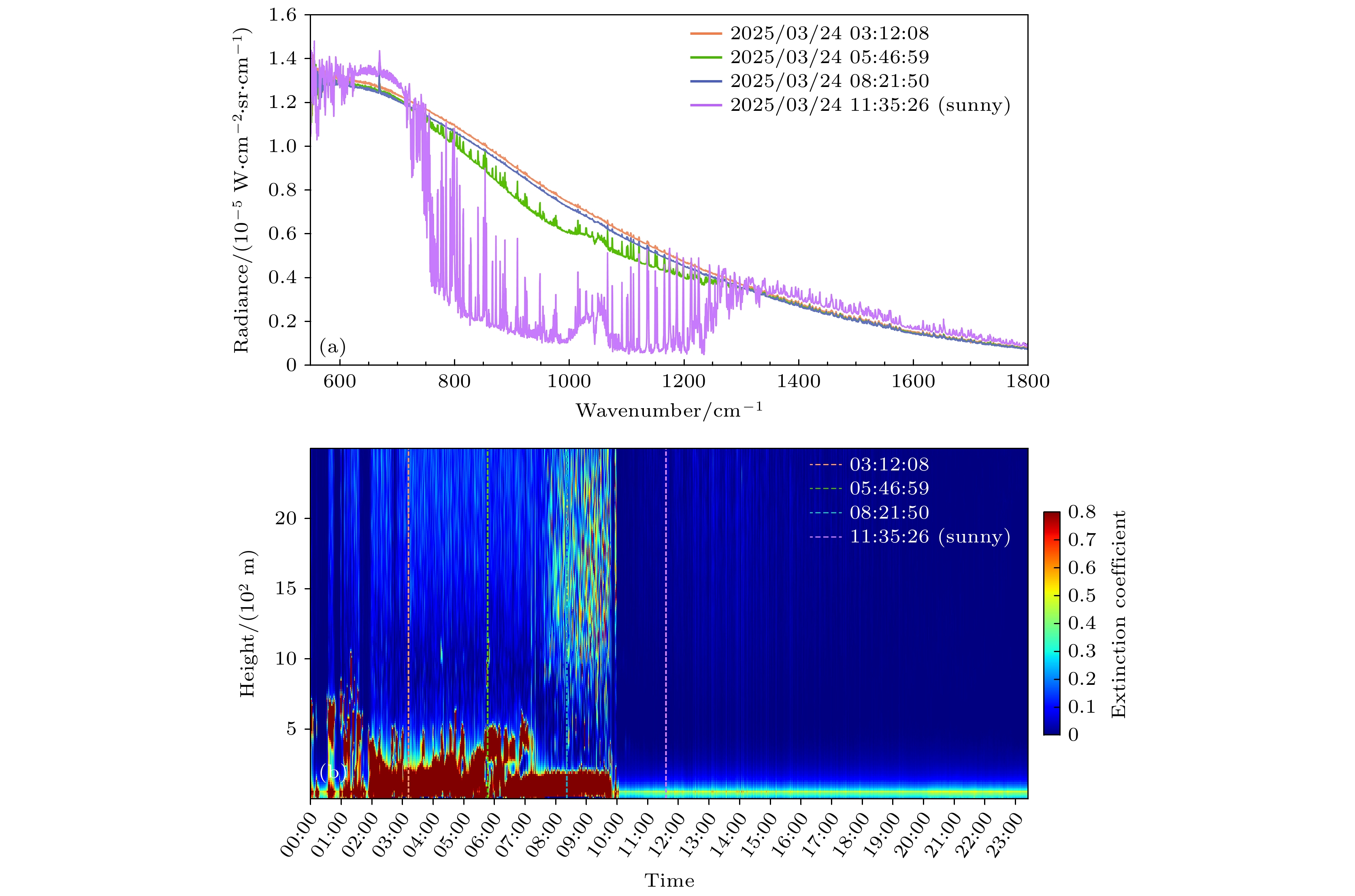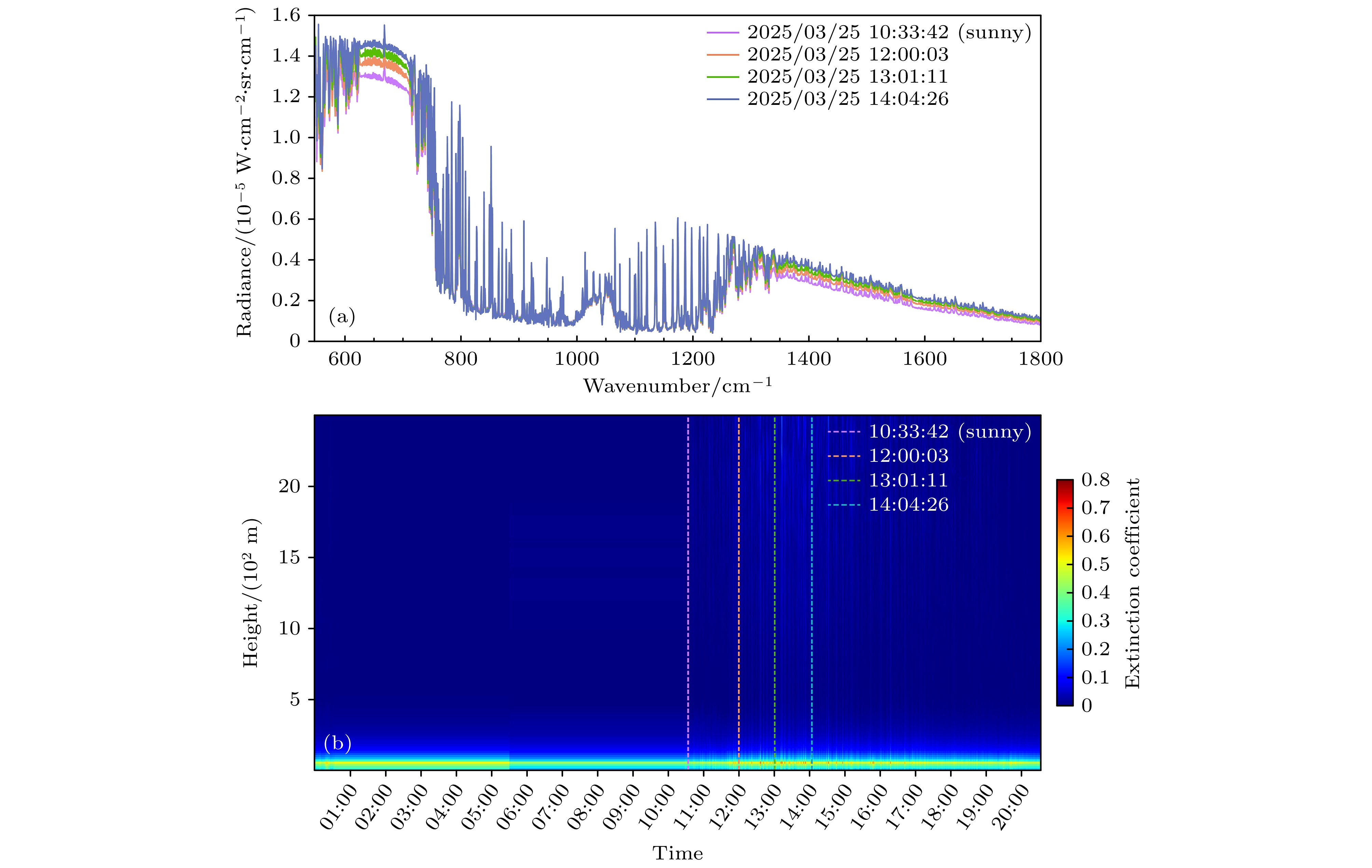 图 10 在2025年3月25日不同时刻, ASSIST在墨脱测得的晴空和薄雾光谱 (a) ASSIST测得的光谱; (b) 激光雷达探测的云和气溶胶总消光系数结果