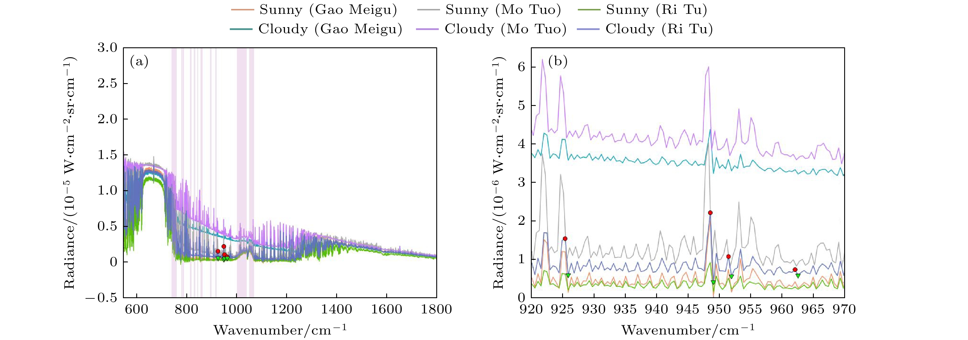Figure 3. The spectral characteristics of clear sky and cloudy conditions in three locations: (a) The spectral characteristics of clear sky and cloudy conditions in the 540–1800 cm–1 band; (b) a local magnified view of the newly added spectral characteristics of clear sky and cloudy conditions in the 920–970 cm–1 band.