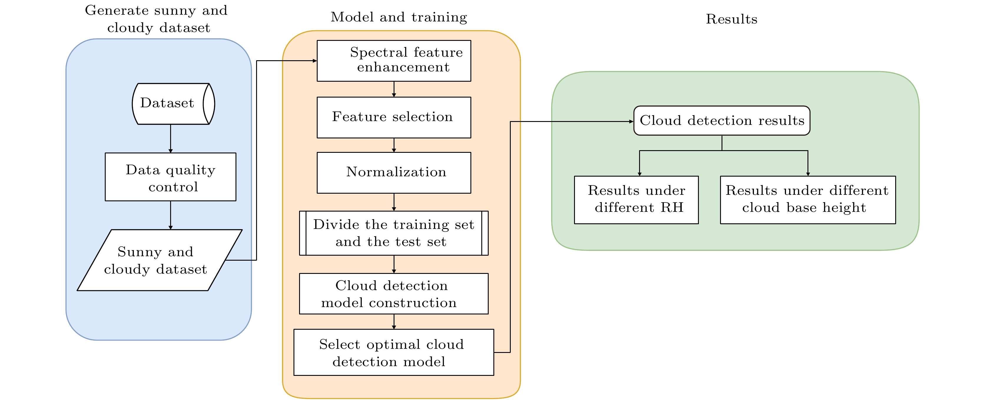 Clouds exert a significant influence on infrared radiation, making cloud detection a crucial step in the application of infrared hyperspectral data. In particular, water vapor interference and the limited accuracy in high-cloud identification constitute two key challenges for ground-based infrared hyperspectral cloud detection. Traditional threshold-based cloud detection methods are difficult to adapt to different locations and dynamically changing atmospheric conditions,while machine learning methods can achieve cloud detection with higher accuracy, greater robustness, and improved automation. Building on the advantages of machine learning, observational data from the atmospheric sounder spectrometer by infrared spectral technology (ASSIST), collected at Lijiang (Yunnan), Motuo (Xizang Autonomous Region), and Ritu (Xizang Autonomous Region) in China, are used to analyze the spectral differences between sunny and cloudy conditions in this study. Based on these differences, a spectral feature enhancement-driven machine learning method for cloud detection is proposed. Finally, by incorporating synchronous observations from lidar, meteorological stations, and all-sky imagers, the proposed method is systematically evaluated under different relative humidity (RH) and cloud base height (CBH) conditions. The experimental results show that the consistency between the results obtained by the proposed method and lidar-based detection is as high as 97.61%. Under different RH conditions, the proposed method outperforms the method based on original spectral features. Notably, when ${\text{RH}} > 70{\text{%}} $, the accuracy of clear-sky spectral identification improves significantly: increasing from 86.01% to 91.89%. Similarly, under different CBH conditions, the proposed method also exhibits superior performance compared with the method in which original spectral features are used. In particular, the accuracy improvements are especially notable when identifying mid-level clouds with ${\text{3 km}} < {\text{CBH}} \leqslant 5{\text{ km}}$, as well as high-level clouds with ${\text{CBH}} > 5{\text{ km}}$. When ${\text{3 km}} < {\text{CBH}} \leqslant 5{\text{ km}}$, the accuracy increases from 95.45% to 98.64% and when ${\text{CBH}} > 5{\text{ km}}$, the accuracy improves from 87.5% to 91.67%. The proposed method significantly enhances the automation and accuracy of cloud detection, thereby providing higher-quality fundamental datasets for supporting subsequent applications such as radiative transfer simulation, remote sensing parameter retrieval, and data assimilation in numerical weather prediction (NWP) models.