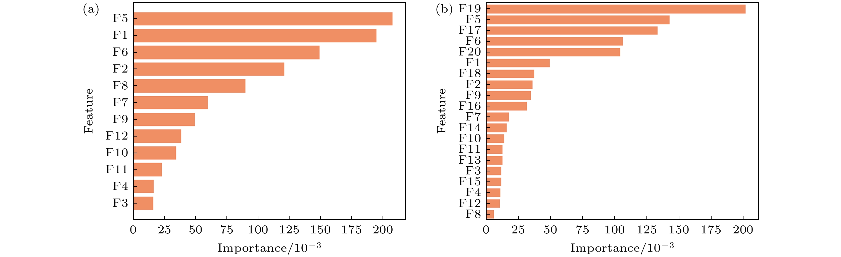 图 5 表2中用于区分有云和无云晴空场景的不同特征重要性排序结果 (a) 使用原始12个特征重要性排序结果; (b) 新增8个特征后重要性排序结果