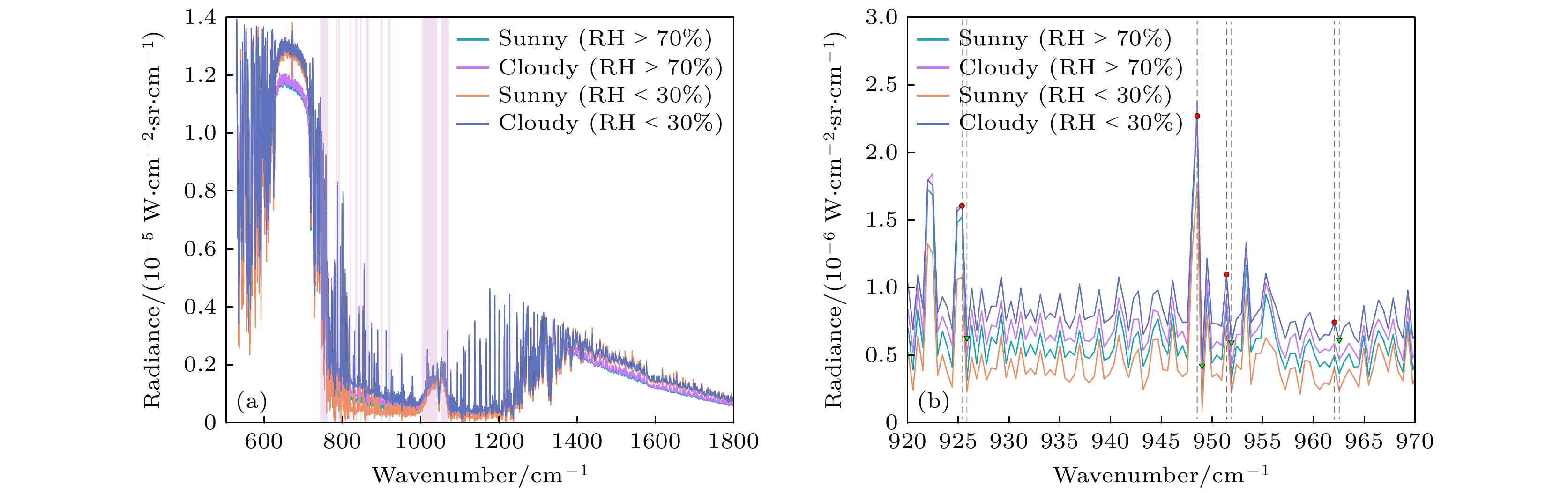 Figure 7. The spectral characteristics of clear sky and cloudy sky measured by ASSIST in Gao Meigu under different RH conditions: (a) The spectral characteristics of clear sky and cloudy conditions in the 540–1800 cm–1 band; (b) a local magnified view of the newly added spectral characteristics of clear sky and cloudy conditions in the 920–970 cm–1 band.