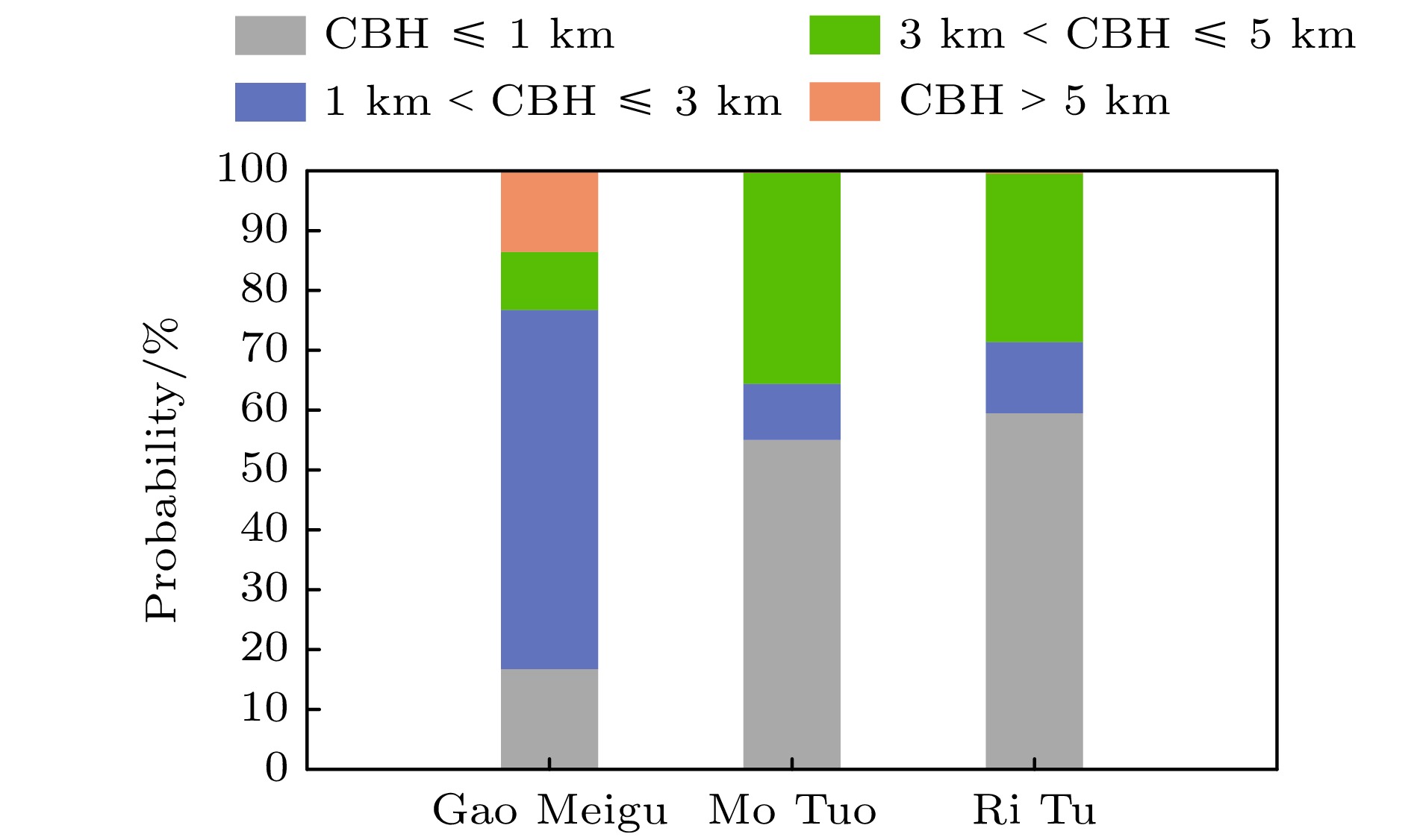 不同CBH 方法 PC/% TPR/% FNR/% ${\text{CBH}} \leqslant 1{\text{ km}}$ 原始方法 98.53 98.53 1.47 新方法 99.26 99.26 0.74 $ 1{\text{ km}} < {\text{CBH}} \leqslant 3{\text{ km}} $ 原始方法 96.43 96.43 3.57 新方法 97.62 97.62 2.38 ${\text{3 km}} < {\text{CBH}} \leqslant 5{\text{ km}}$ 原始方法 95.45 95.45 4.55 新方法 98.64 98.64 1.36 ${\text{CBH}} > 5{\text{ km}}$ 原始方法 87.50 87.50 12.5 新方法 91.67 91.67 8.33 -