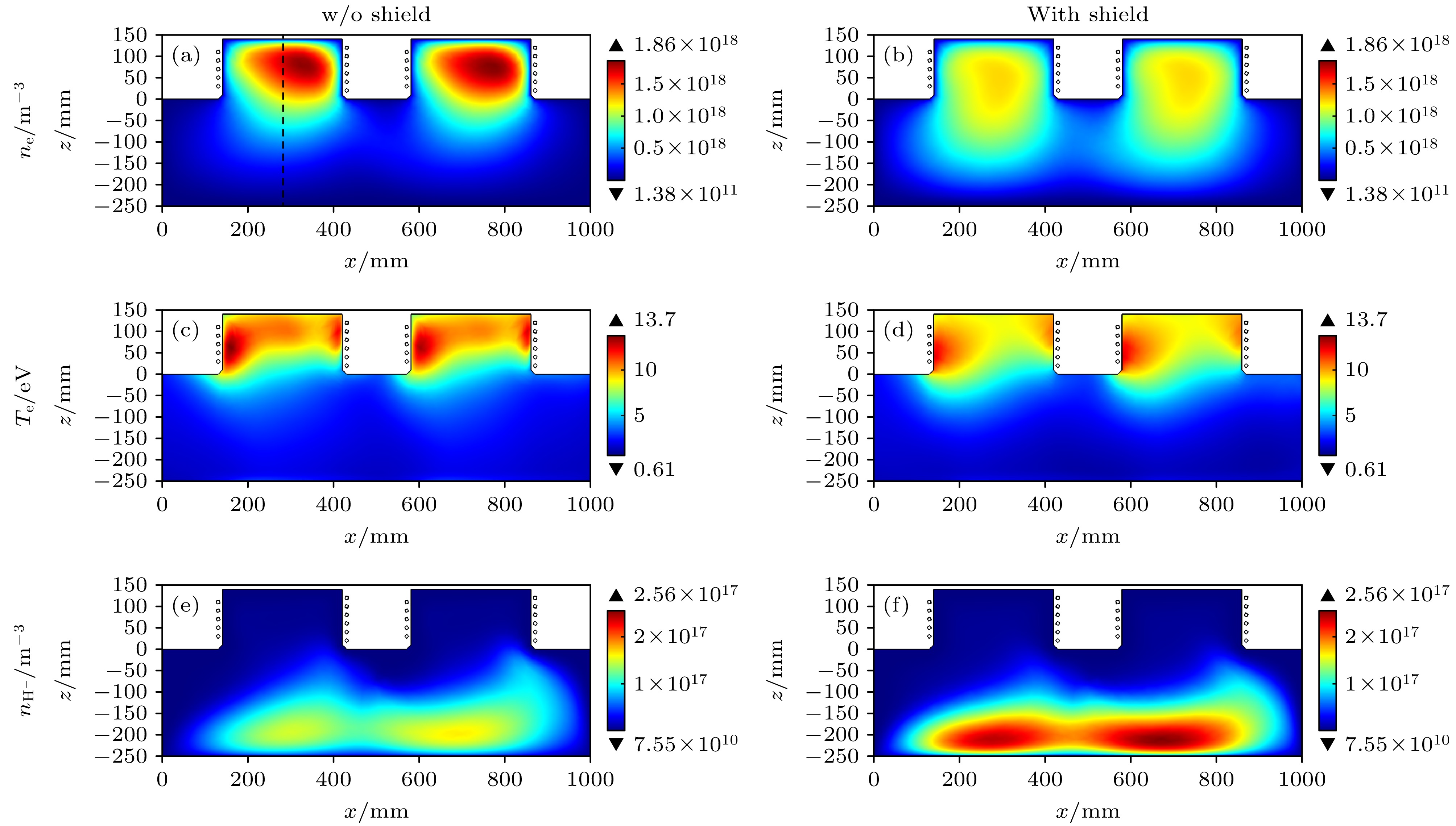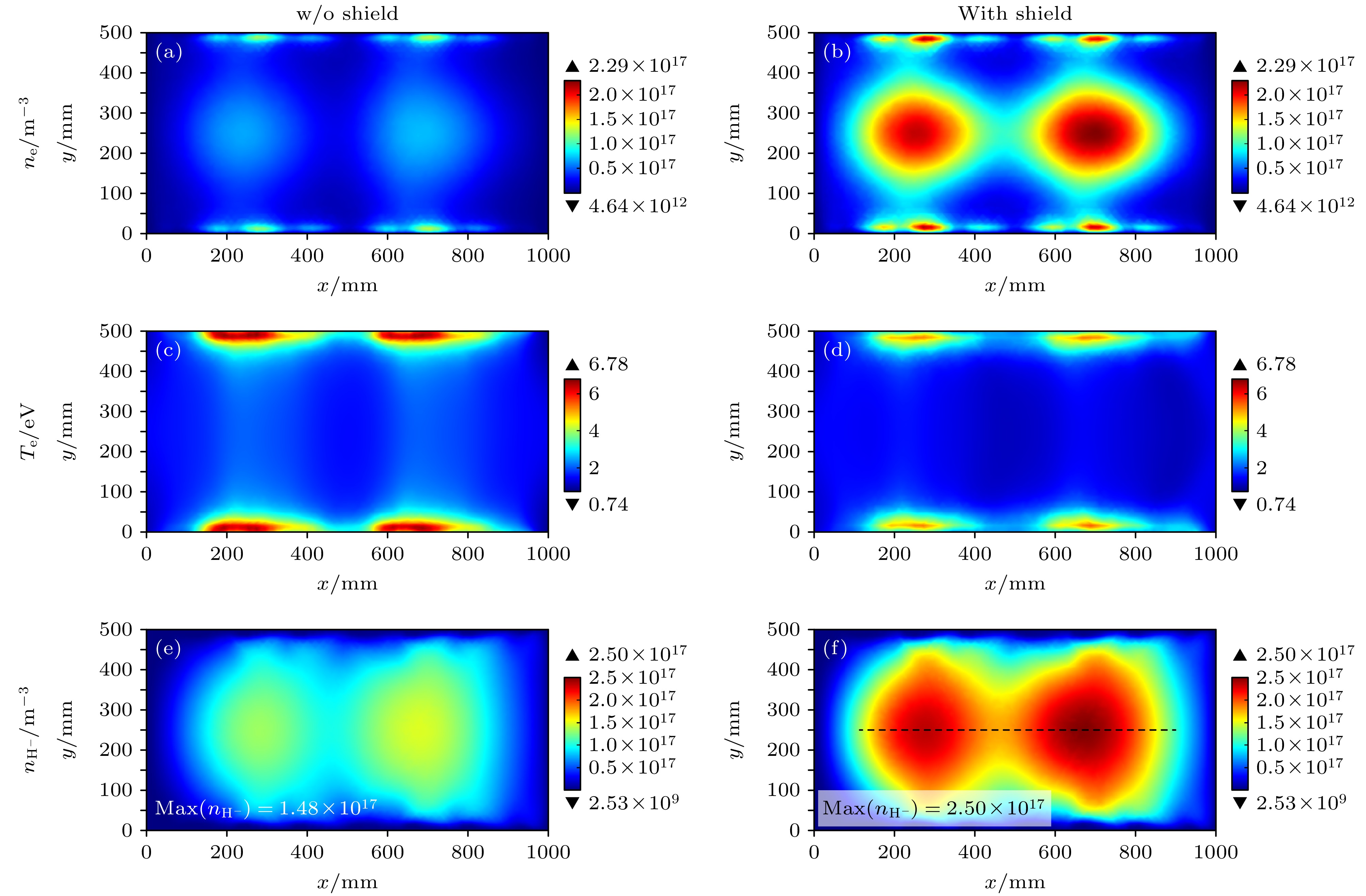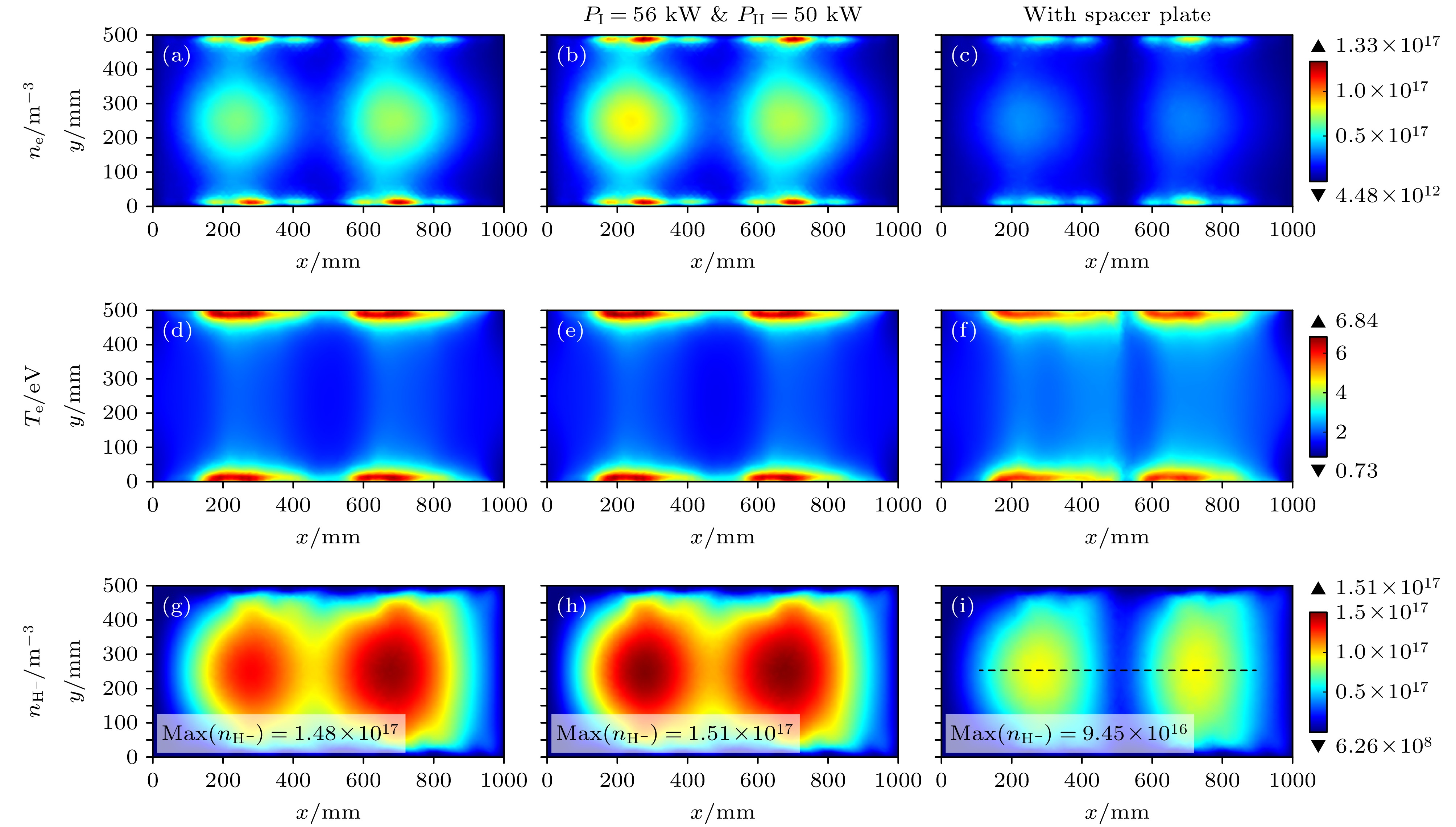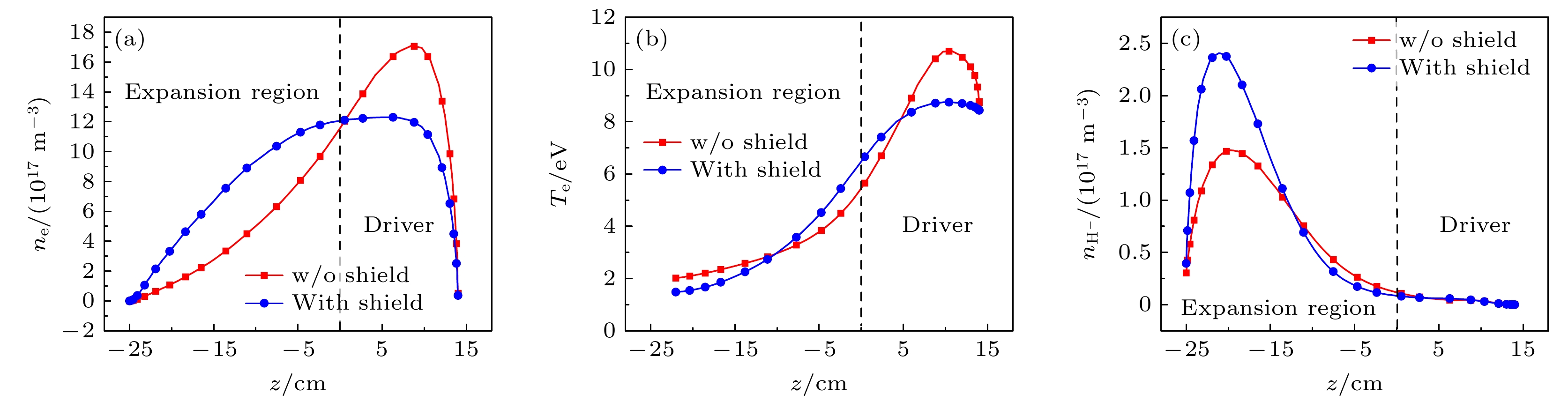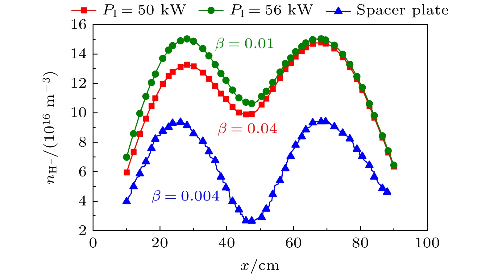 In neutral beam injection (NBI), which is a primary auxiliary heating method for tokamak plasmas, the negative hydrogen ion source (NHIS) functions as a critical front-end component governing neutral beam quality. The performance of NHIS remains a key challenge. This work presents a three-dimensional (3D) fluid model, which is developed for a double-driver NHIS to simulate and optimize surface-generated negative hydrogen ion density. A comparison of plasma parameters between the NHIS with Cs and without Cs shows that surface generation yields negative ion density one order of magnitude higher than volume generation. However, the presence of the magnetic filter field induces asymmetry in negative ion density within the extraction region. To improve this asymmetry, two approaches are proposed: 1) increasing the power of one of the drivers and 2) adding a spacer plate to the expansion region. After increasing the power of Driver I from 50 to 56 kW, the H– density asymmetry at the y = 25 cm intercept on the xy-plane (z = –22 cm) decreases from 0.04 to 0.01, and the value of H– density increases. Following the addition of a spacer plate, the H– density asymmetry further decreases to 0.004, but the value of H– density also shows a significant reduction. Finally, adding a magnetic shield to the back plate of the expansion region further optimizes H– density from 1.48×1017 m–3 to 2.50×1017 m–3, yielding a 69% increase downstream. This is because increased plasma transport into the expansion region enhances the dissociation rate of H2 molecules, thereby yielding more H atoms. The attenuation of the magnetic filter field in the driver region after adding a magnetic shield also enhances the symmetry of the H– density.