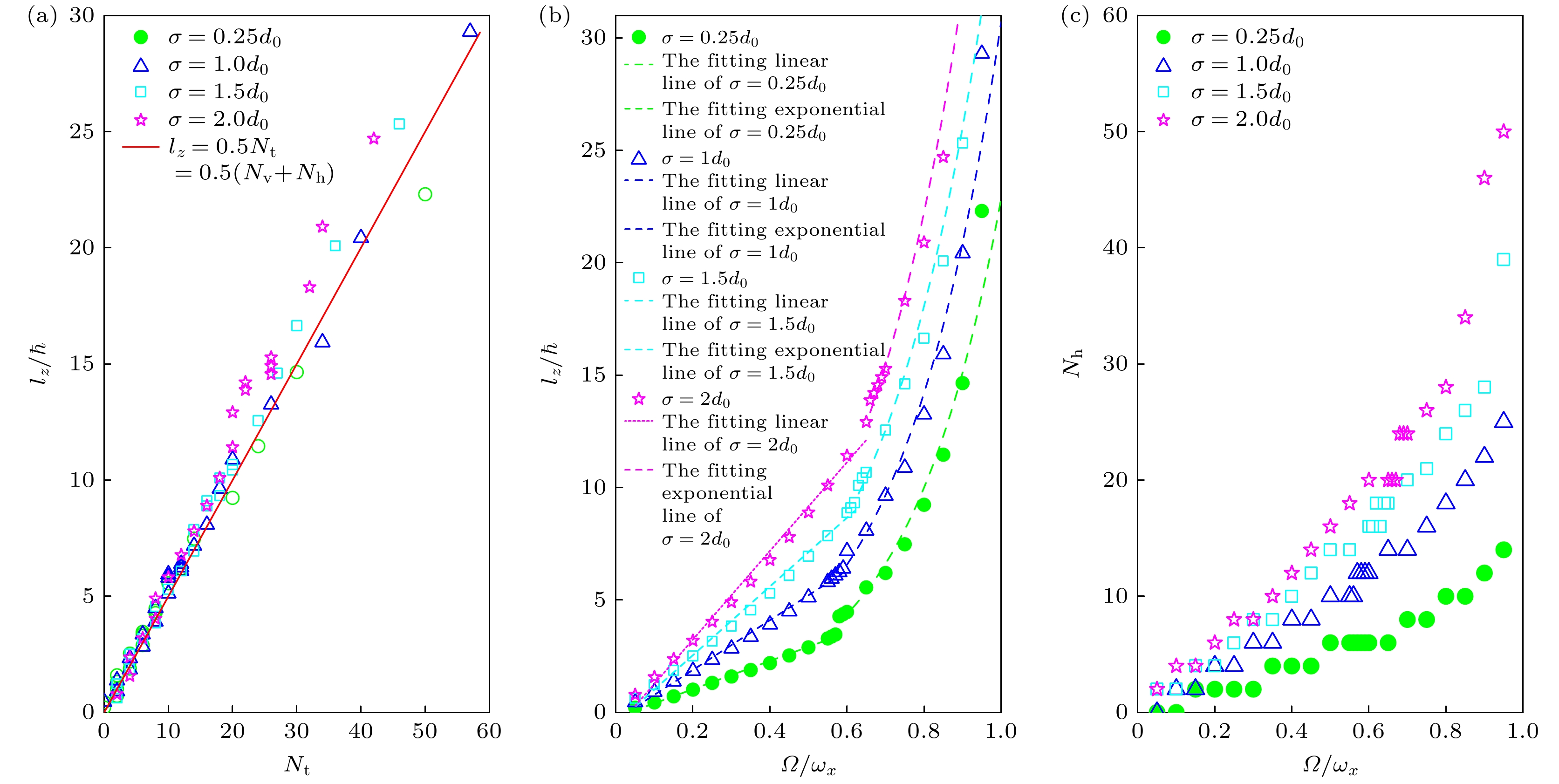 图 1 不同势阱宽度$ \sigma $下, (a) $ {l_z} $与不同$ \varOmega $下生成的涡旋总数$ {N_{\text{t}}} $的关系, (b) $ {l_z} $与$ \varOmega $的关系, 以及(c) $ {N_{\text{h}}} $与$ \varOmega $的关系