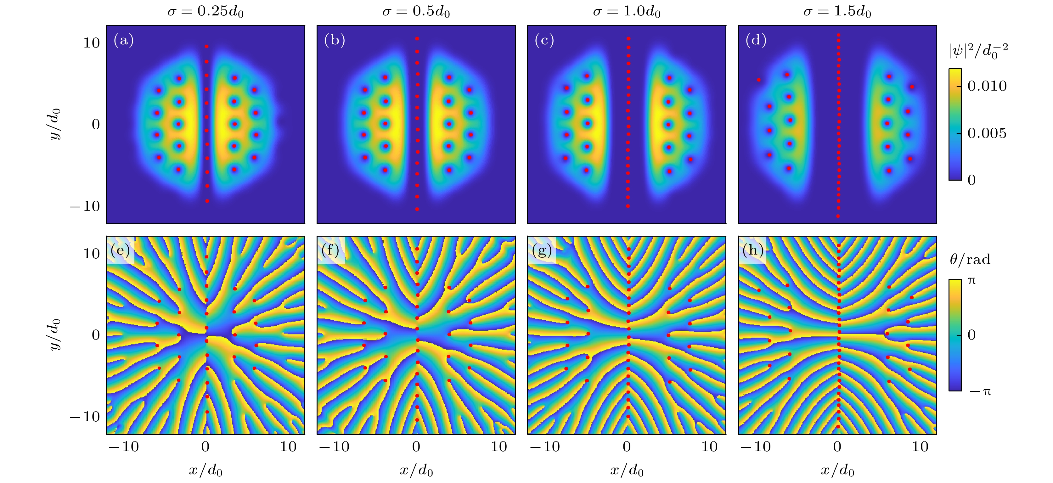 Figure 2. Density distribution $ {\left| \psi \right|^{2}} $ (the first row) and phase distribution of $ \psi $ (the second row) for different widths $ \sigma $ at $ t = 250\omega _x^{ - 1} $ after rotating the double-well potential with $ \varOmega = 0.9{\omega _x} $.