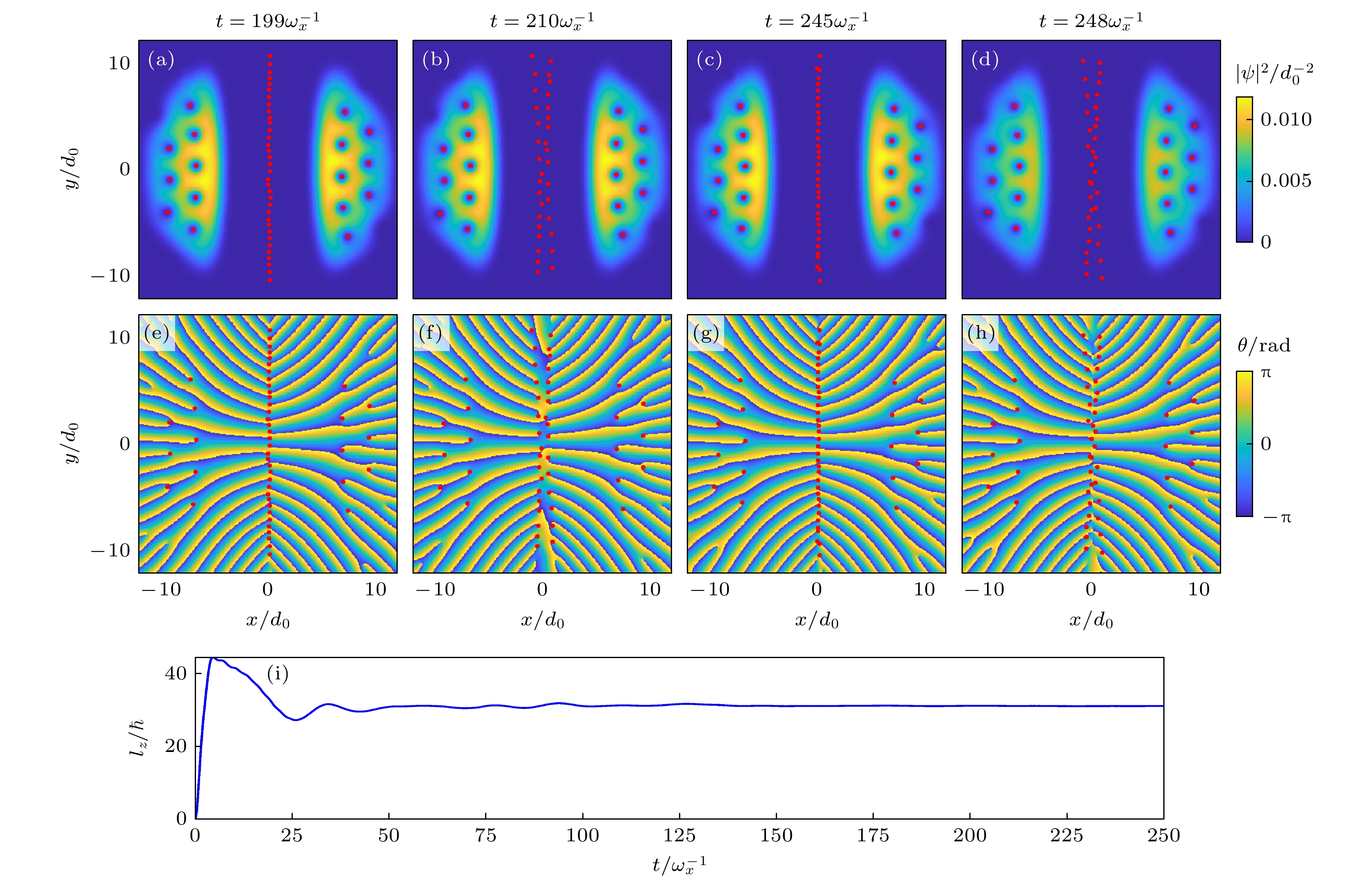 Figure 3. Density distribution $ {\left| \psi \right|^{2}} $ (the first row), phase distribution of $ \psi $ (the second row), and time evolution of $ {l_z} $(the third row) for $ \sigma = 2{d_0} $ after the double-well potential suddenly begins to rotate with $ \varOmega = 0.9{\omega _x} $.
