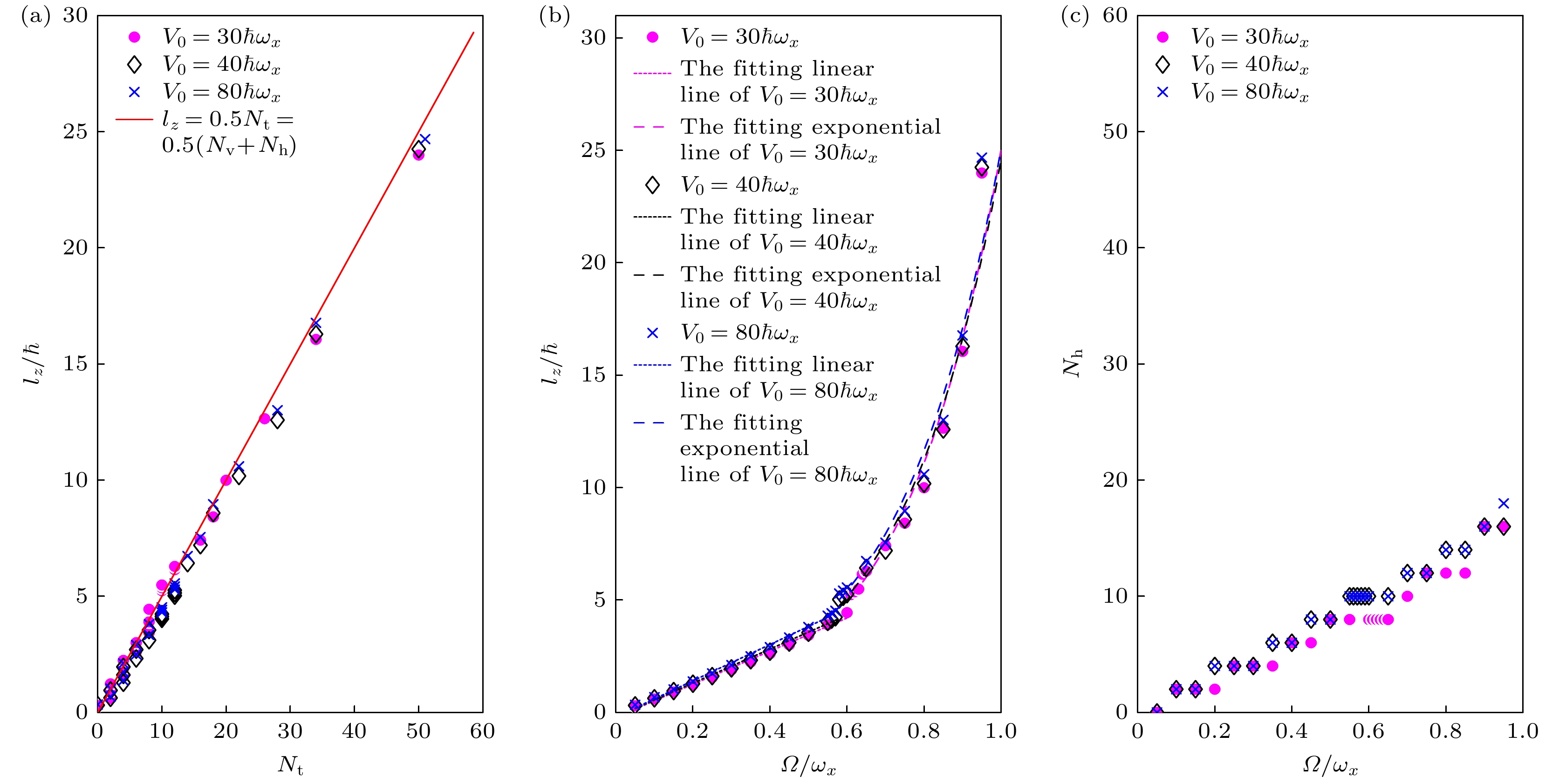 图 4 不同势阱高度$ {V_0} $下, (a) $ {l_z} $与不同$ \varOmega $下生成的涡旋总数$ {N_{\text{t}}} $的关系, (b) $ {l_z} $与$ \varOmega $的关系, (c) $ {N_{\text{h}}} $与$ \varOmega $的关系