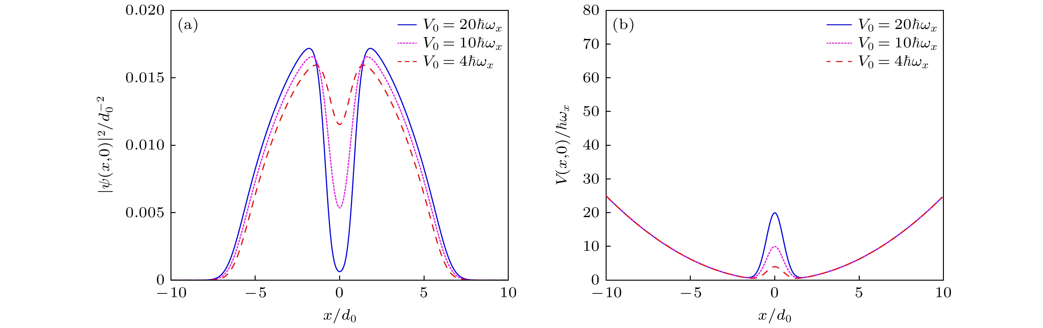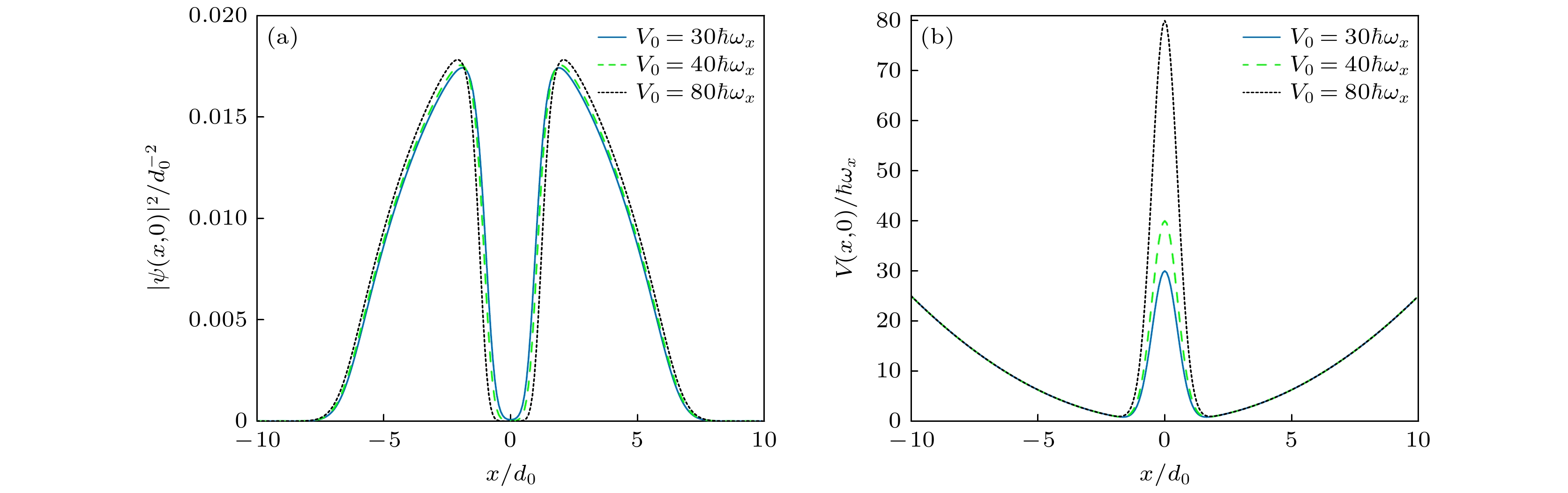 Figure 7. (a) Cross-sectional plots $ {\left| {\psi (x, 0)} \right|^2} $ of the initial ground state density and (b) sectional view $ V(x, 0) $ of the potential well along the x-axis for $ {V_0} \lt 25\hbar {\omega _x} $.