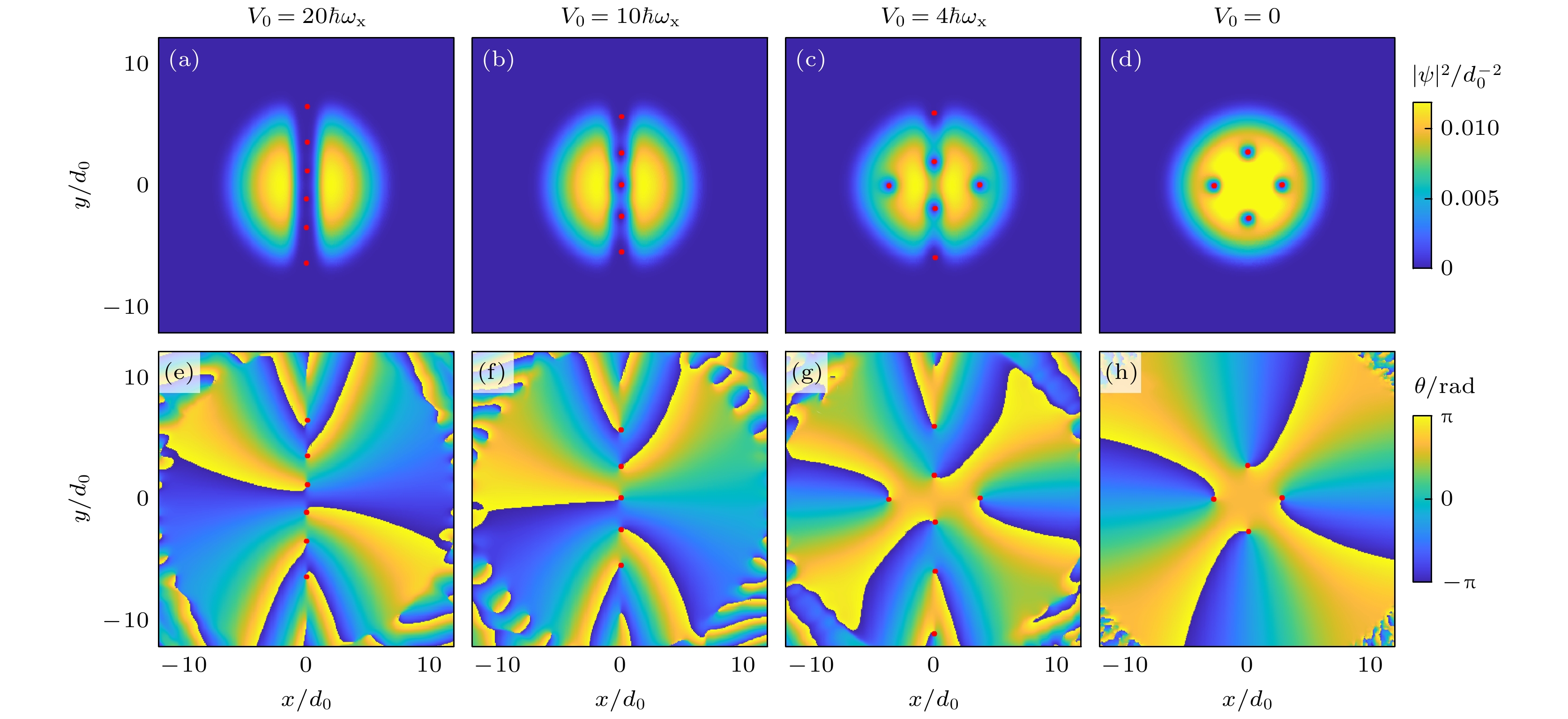 Figure 6. Density distribution $ {\left| \psi \right|^{2}} $ (the first row) and phase distribution of $ \psi $ (the second row) for different heights $ {V_0} $ at $ t = 250\omega _x^{ - 1} $ after rotating the double-well potential with $ \varOmega = 0.5{\omega _x} $.
