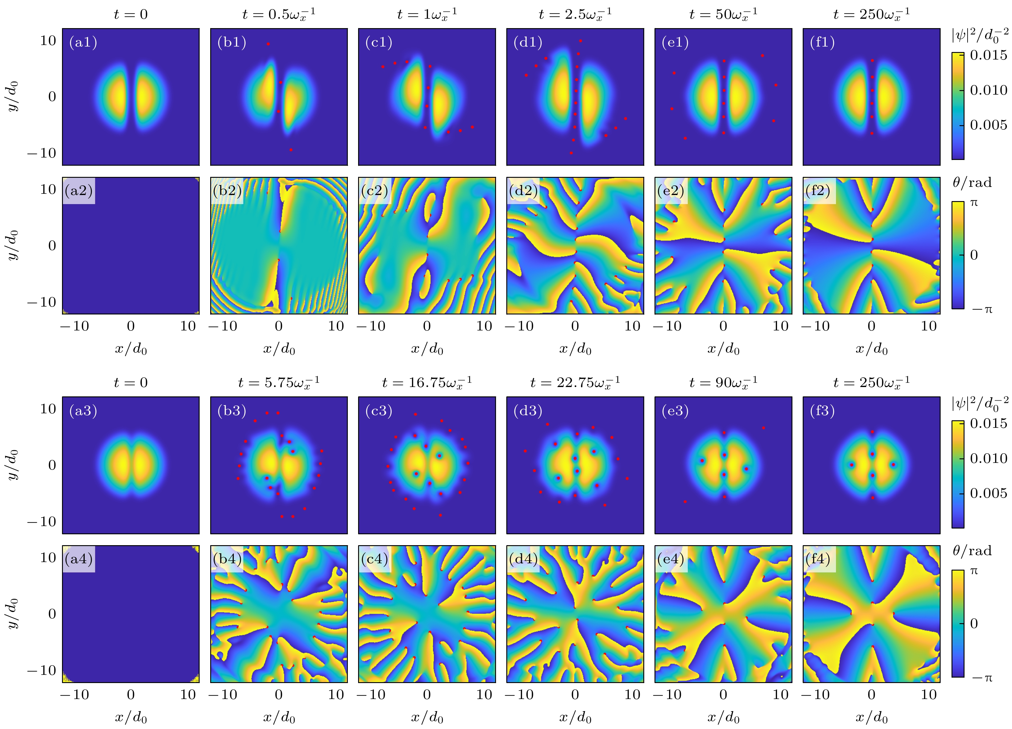 Figure 8. Time evolution of the density distribution $ {\left| \psi \right|^{2}} $ and phase distribution of $ \psi $ after the double-well potential suddenly begins to rotate with $ \varOmega = 0.5{\omega _x} $. Among them, $ {V_0} = 20\hbar {\omega _x} $ in the first and second rows, and $ {V_0} = 4\hbar {\omega _x} $ in the third and fourth rows.