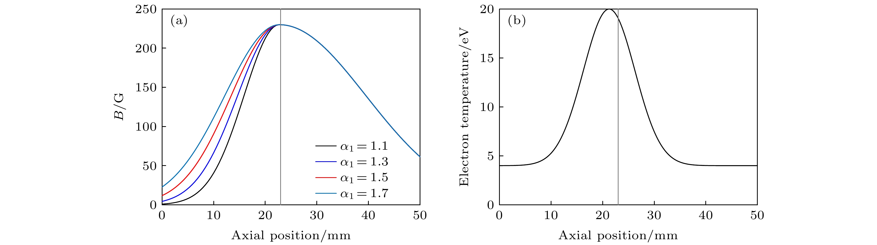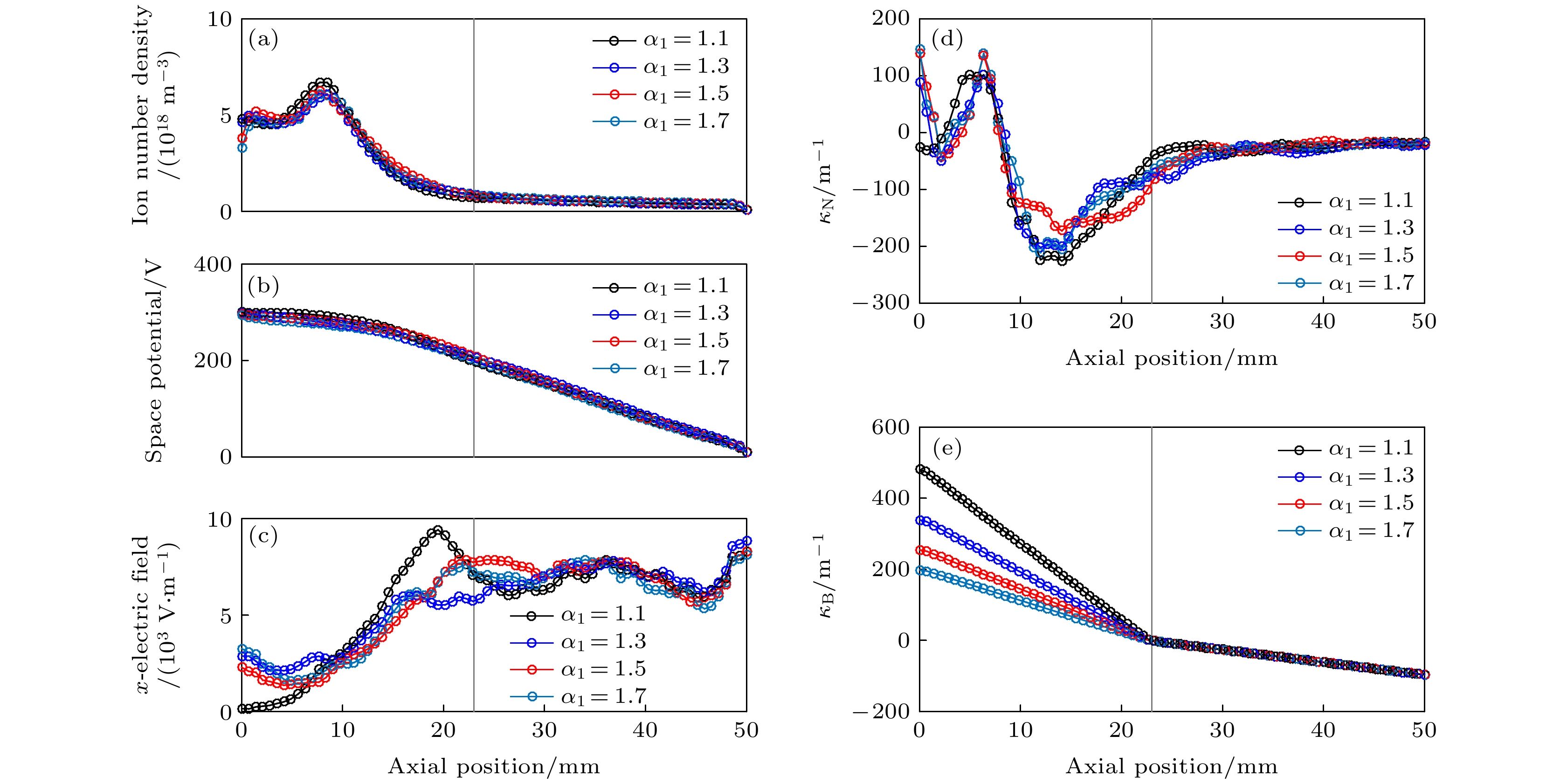 Figure 5. The axial distribution of (a) ion density profile, (b) space potential, (c) electric field, and (d) the density gradient ${\kappa _{\text{N}}}$, (e) the magnetic field gradient ${\kappa _{\text{B}}}$, for ${\alpha _1} = 1.1$, 1.3, 1.5, 1.7, respectively.