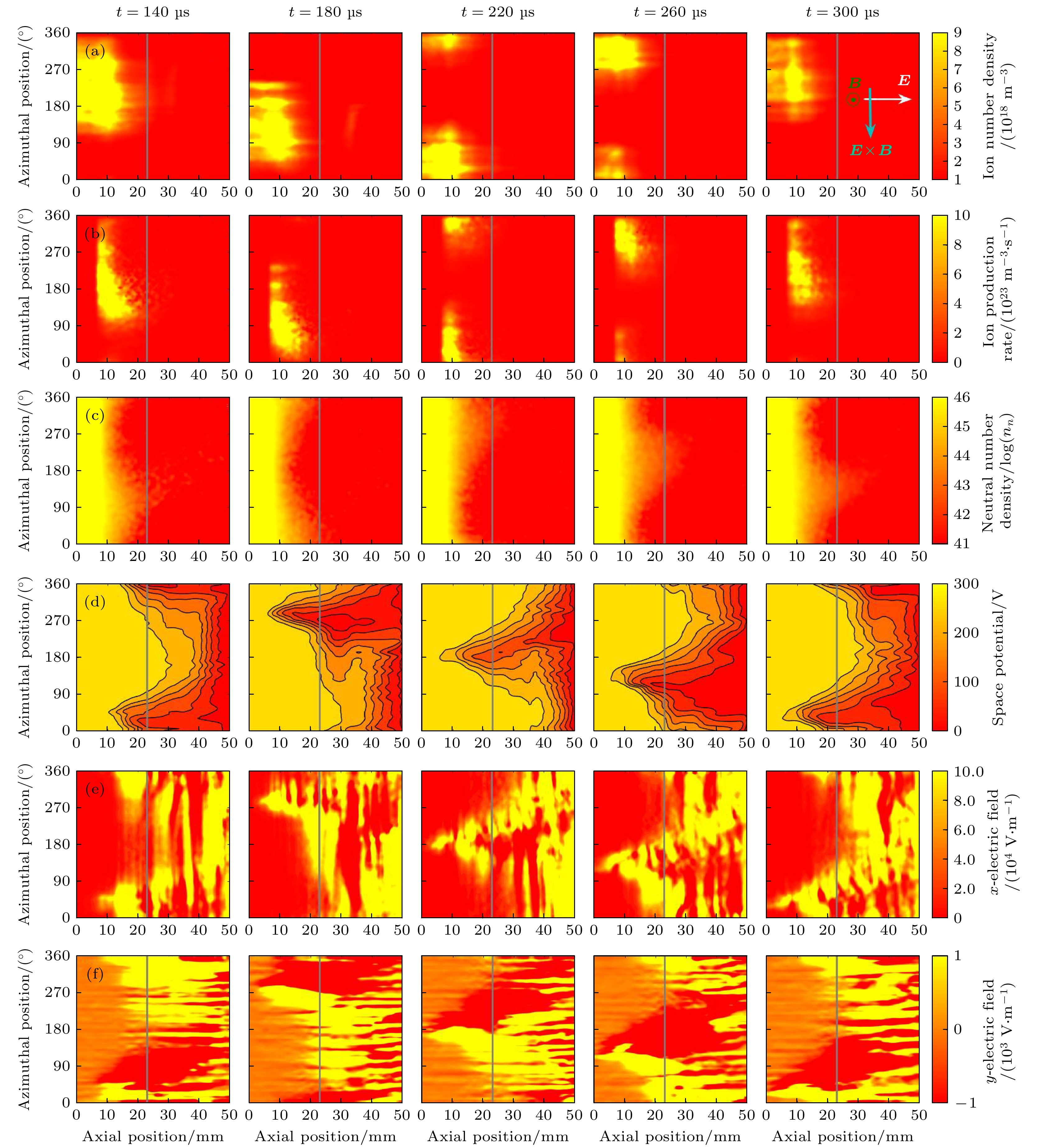 Figure 2. Distribution of ion number density (a), ionization rate (b), neutral particle number density (c), electrical potential (d), axial electric field (e), and azimuthal electric field (f) at different time in one period for ${\alpha _1} = 1.1$.